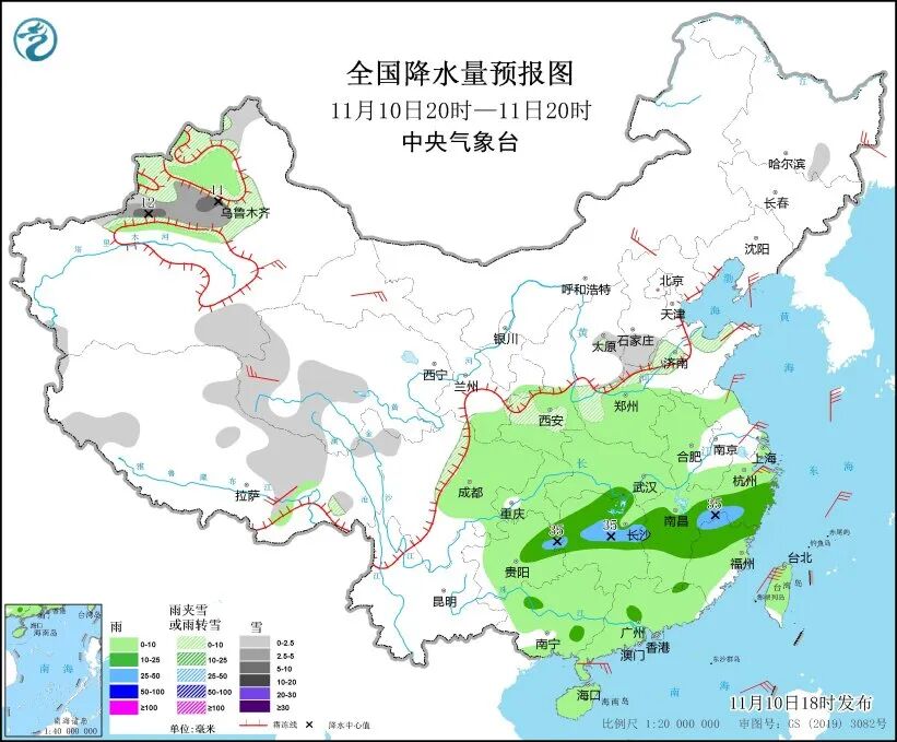 11月10日20时至11日20时,新疆北疆中西部、沿天山一带和南疆盆地北部、西藏东北部、青海中西部、陕西中部、山西东部、河北南部、山东北部、河南北部、川西高原北部等地部分地区有小雪或雨夹雪,其中,新疆沿天山一带和伊犁河谷等地部分地区有中到大雪,局地暴雪。湖北南部、湖南中北部、江西中部、浙江中南部、福建北部、贵州东北部以及广西中部、广东中部等地部分地区有中雨,贵州东北部、湖南中部、江西东部、浙江西南部、福建西北部有大雨。