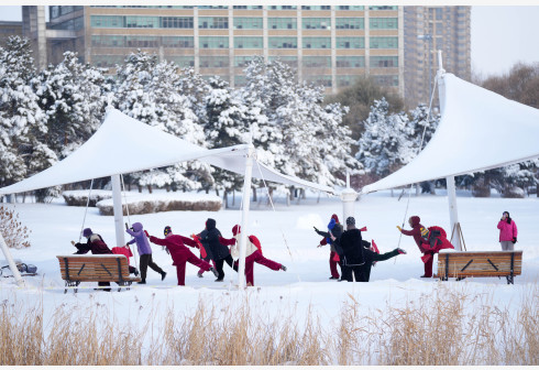 11月23日,在哈尔滨市湘江公园,市民在健身。受寒潮影响,黑龙江省各地近日持续降温,预计大兴安岭北部地区最低气温可突破零下30摄氏度。新华社记者 王建威 摄