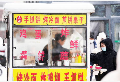 11月23日,哈尔滨市民在雪中买早餐。受寒潮影响,黑龙江省各地近日持续降温,预计大兴安岭北部地区最低气温可突破零下30摄氏度。新华社记者 王建威 摄