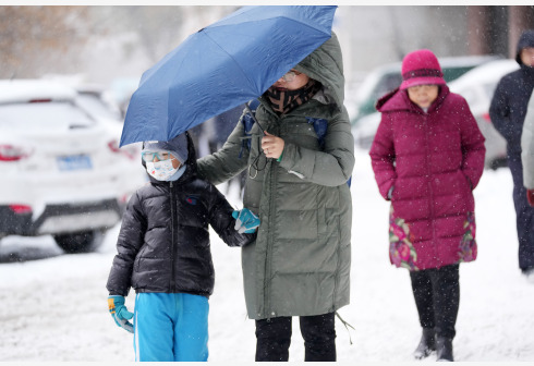 11月23日,哈尔滨市民在雪中送孩子上学。受寒潮影响,黑龙江省各地近日持续降温,预计大兴安岭北部地区最低气温可突破零下30摄氏度。新华社记者 王建威 摄