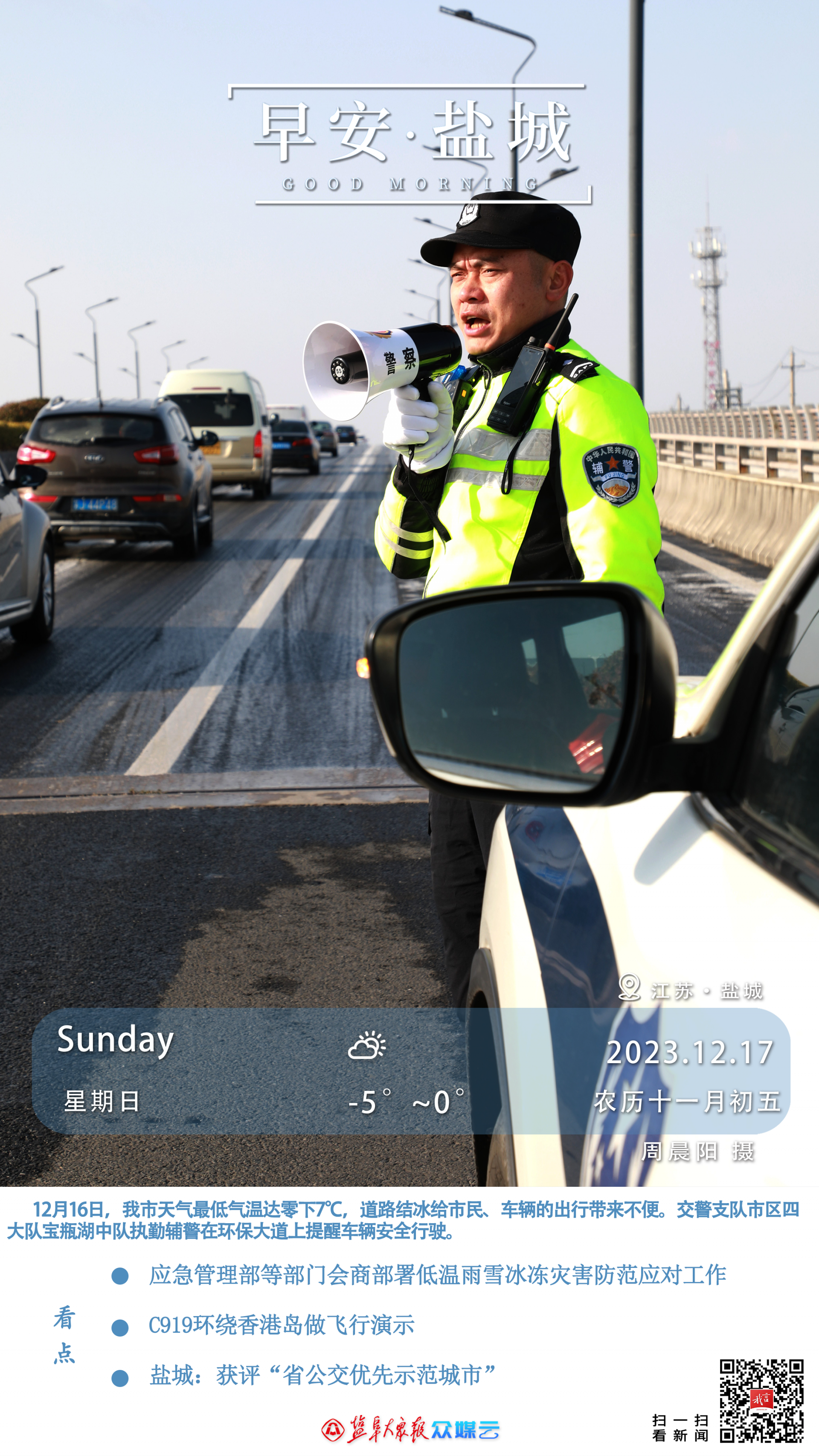 读者朋友,早上好!今天是2023年12月17日,星期日,癸卯年十一月初五。今天最低气温-5℃,有严重冰冻,最高气温0℃。