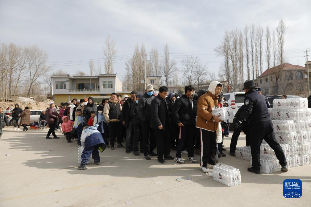 12月19日,在甘肃临夏积石山县大河家镇大河村安置点,受灾群众领取矿泉水。 12月18日23时59分,甘肃临夏州积石山县发生6.2级地震。 当前,甘肃、青海已组织力量开展抢险救援,并紧急调拨帐篷、折叠床、棉被等救灾物资运抵灾区,全力做好受灾群众救助。目前抗震救灾各项工作正在紧张有序进行。 新华社记者 方欣 摄