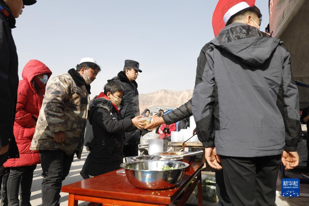 12月19日,在甘肃临夏积石山县大河家镇大河村安置点,受灾群众排队取餐。 12月18日23时59分,甘肃临夏州积石山县发生6.2级地震。 当前,甘肃、青海已组织力量开展抢险救援,并紧急调拨帐篷、折叠床、棉被等救灾物资运抵灾区,全力做好受灾群众救助。目前抗震救灾各项工作正在紧张有序进行。 新华社记者 张文静 摄