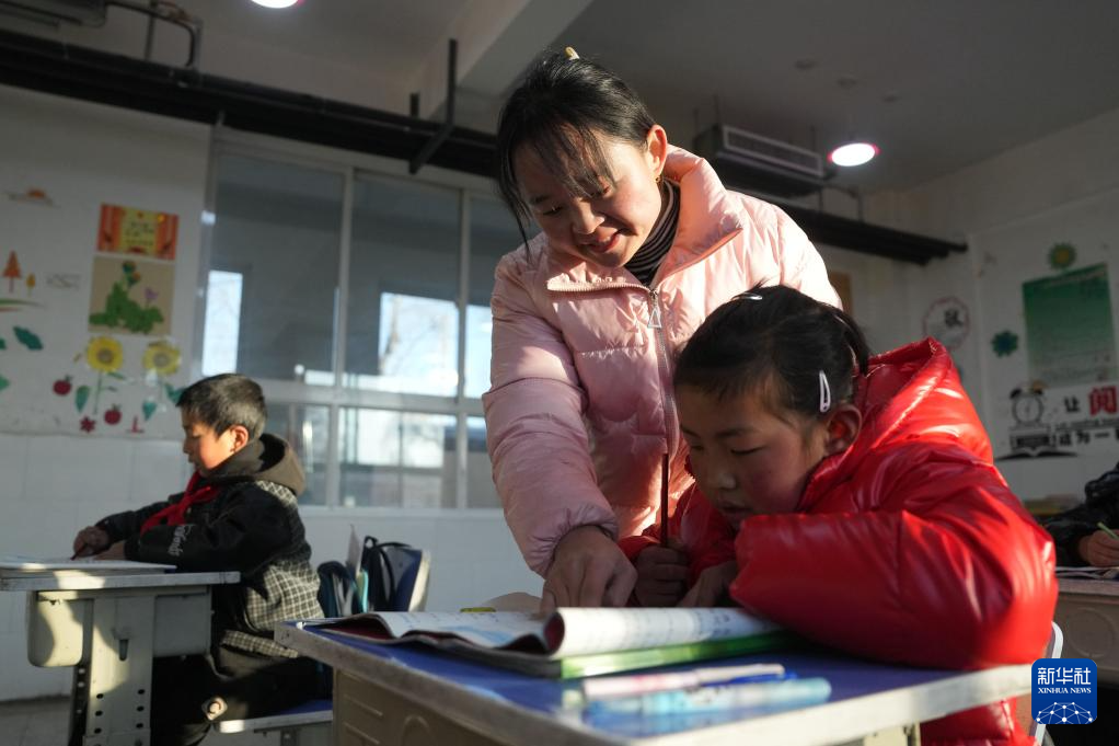 12月25日,积石山县柳沟乡阳山希望小学的老师给学生辅导。 当日,甘肃积石山地震灾区中小学校开始复课。据积石山县教育局介绍,全县244所学校中,经鉴定能安全使用的学校,学生在12月25日至29日陆续返校上课,没条件开学的学校,教师下沉到安置点开展教学辅导,以尽早恢复教学秩序。 新华社记者 陈斌 摄