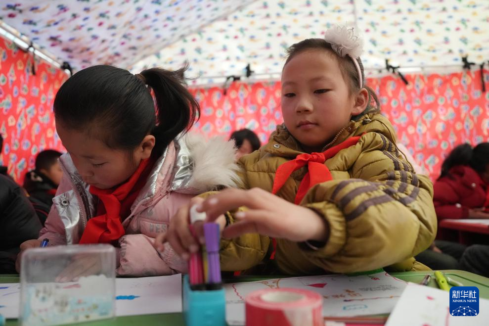 12月25日,在柳沟乡斜套村一临时教学点,学生在帐篷里上心理辅导课。 当日,甘肃积石山地震灾区中小学校开始复课。据积石山县教育局介绍,全县244所学校中,经鉴定能安全使用的学校,学生在12月25日至29日陆续返校上课,没条件开学的学校,教师下沉到安置点开展教学辅导,以尽早恢复教学秩序。 新华社记者 陈斌 摄
