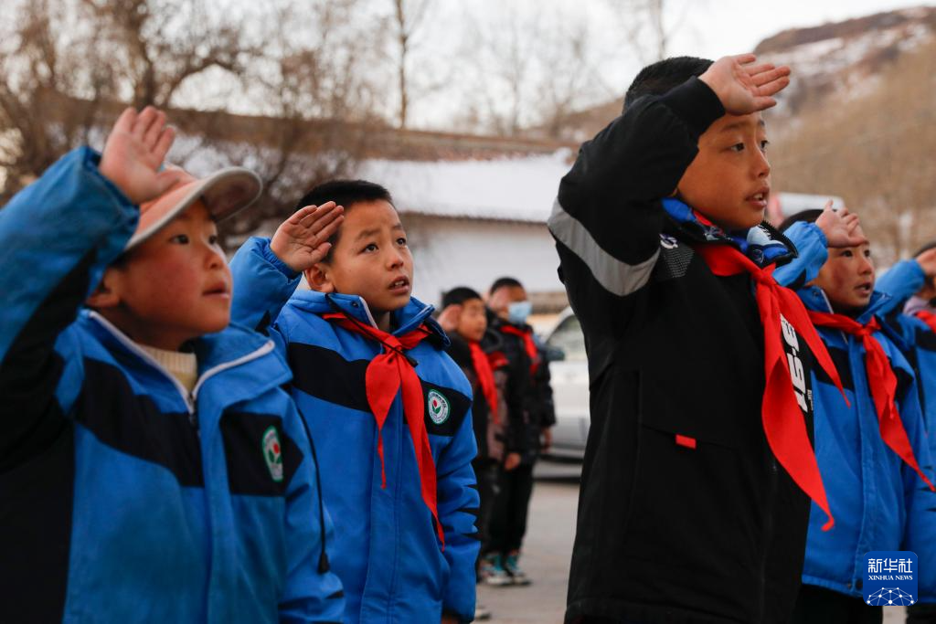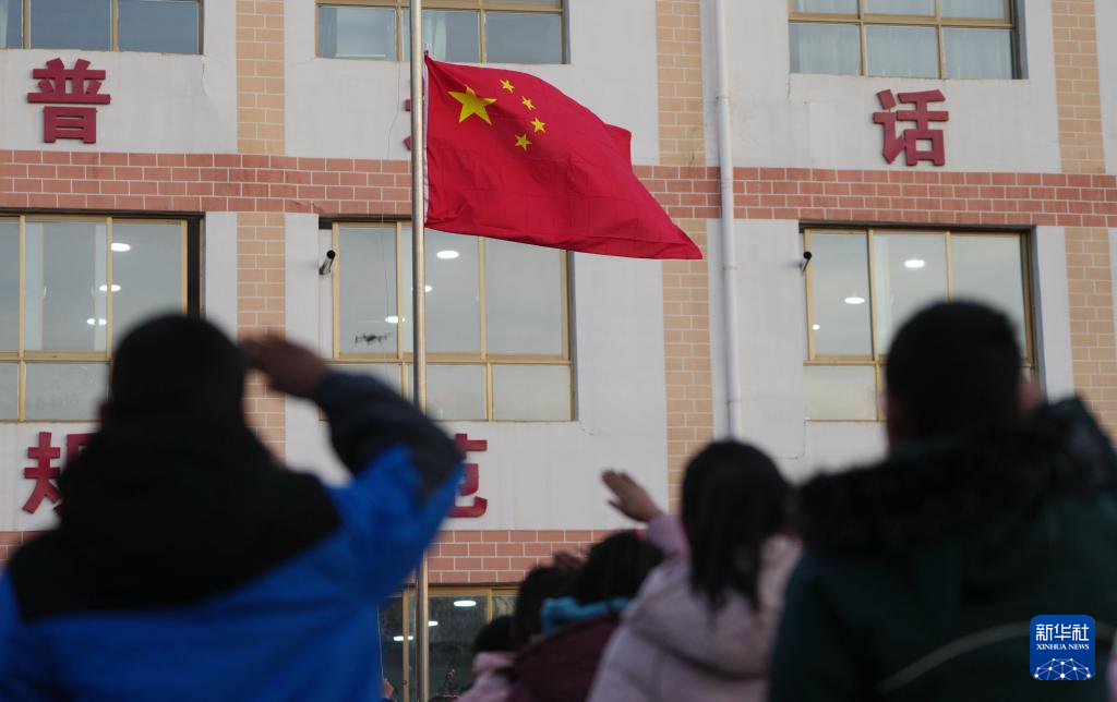 12月25日,积石山县柳沟乡阳山希望小学的学生在复课首日举行升旗仪式。 当日,甘肃积石山地震灾区中小学校开始复课。据积石山县教育局介绍,全县244所学校中,经鉴定能安全使用的学校,学生在12月25日至29日陆续返校上课,没条件开学的学校,教师下沉到安置点开展教学辅导,以尽早恢复教学秩序。 新华社记者 陈斌 摄