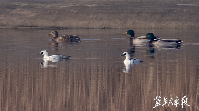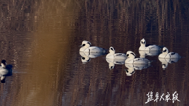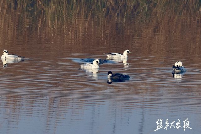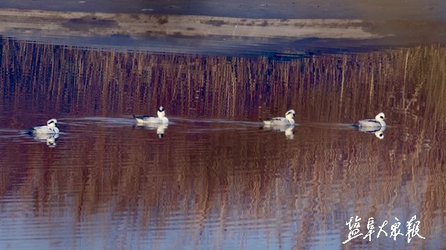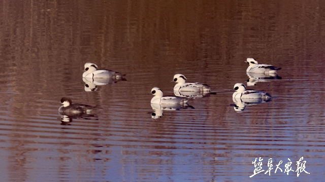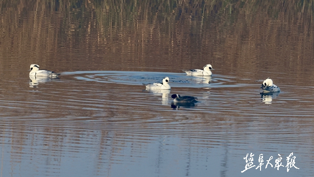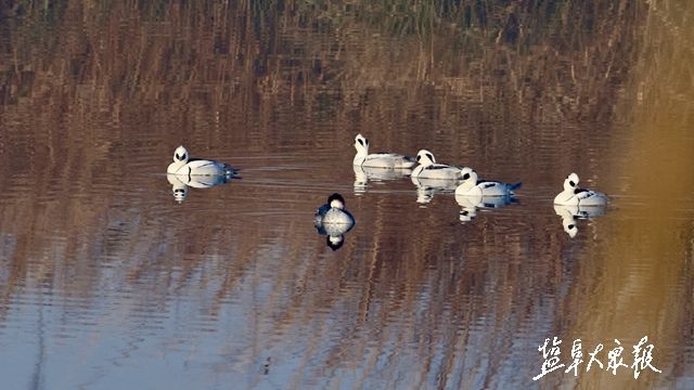 1月5日,东台条子泥湿地,一群被称作熊猫鸭的白秋沙鸭在水中悠闲觅食。白秋沙鸭学名斑头秋沙鸭,雄鸟全身以黑白两色为主,周身雪白,眼部、枕部、背部有黑色斑块,翅羽尾羽呈灰黑色。尤其是眼部的黑斑,与大熊猫几乎一模一样,因此有了熊猫鸭的昵称。2012 年斑头秋沙鸭被列入世界自然保护联盟濒危物种红色名录,为我国 “三有” 保护动物(指国家保护的有重要生态、科学、社会价值的陆生野生动物)。它们是大自然的“生态检验师”,对生存环境极为挑剔,是大气和水质监测鸟。成群的熊猫鸭等冬季候鸟每年来到条子泥越冬,从侧面反映了条子泥湿地生态良好、环境优越。 (盐阜大众报报业集团融媒体记者 周晨阳 摄 通讯员 李东明)责任编辑:于 楠 胡丽丽 胡 祥