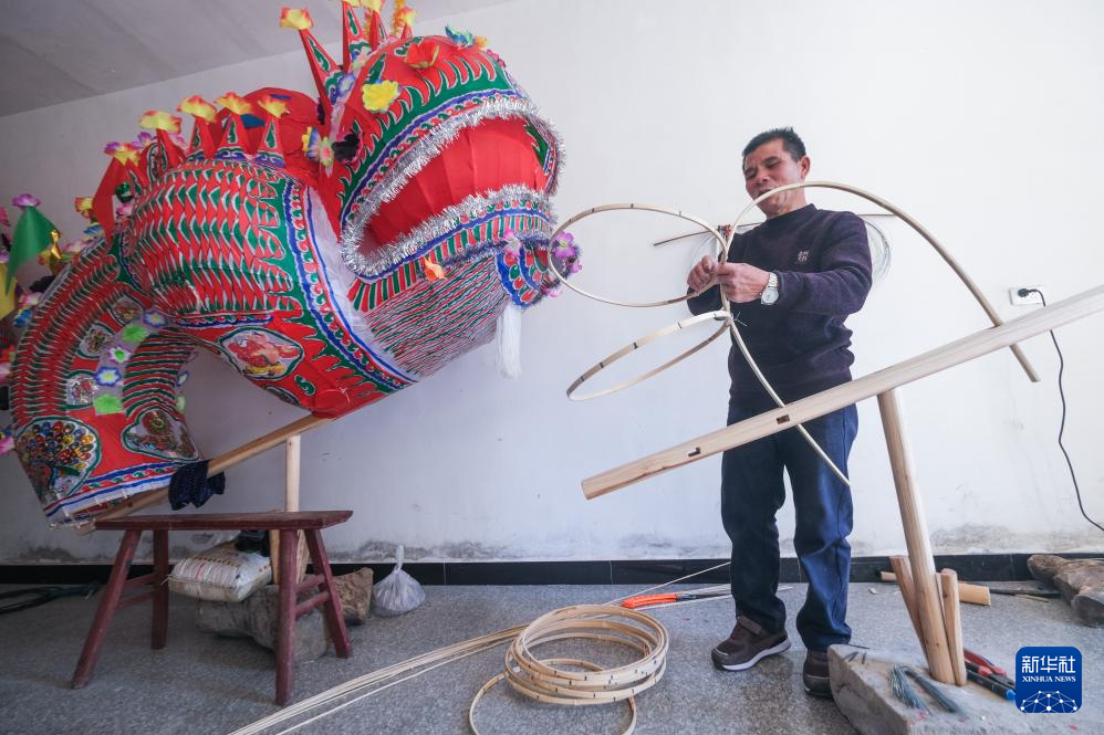 1月13日,青田县温溪镇的陈建南正在制作龙灯,为春节“唱龙灯”做准备。青田唱龙灯习俗是丽水市非物质文化遗产代表性保护项目,从正月初二开始,龙灯配上唱龙灯艺人到各村进行表演,祈求风调雨顺、平安有福。随着农历新年的临近,浙江省丽水市青田县的乡镇及城区开始做龙灯、办灯展,形态各异的传统龙灯为迎接龙年新春佳节营造出浓浓的喜庆氛围。