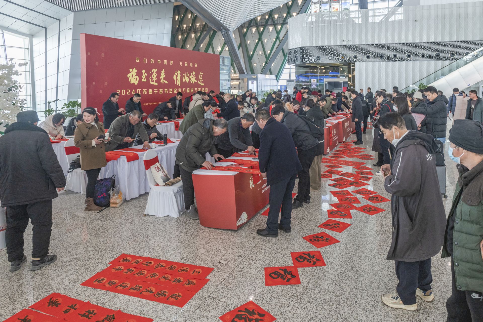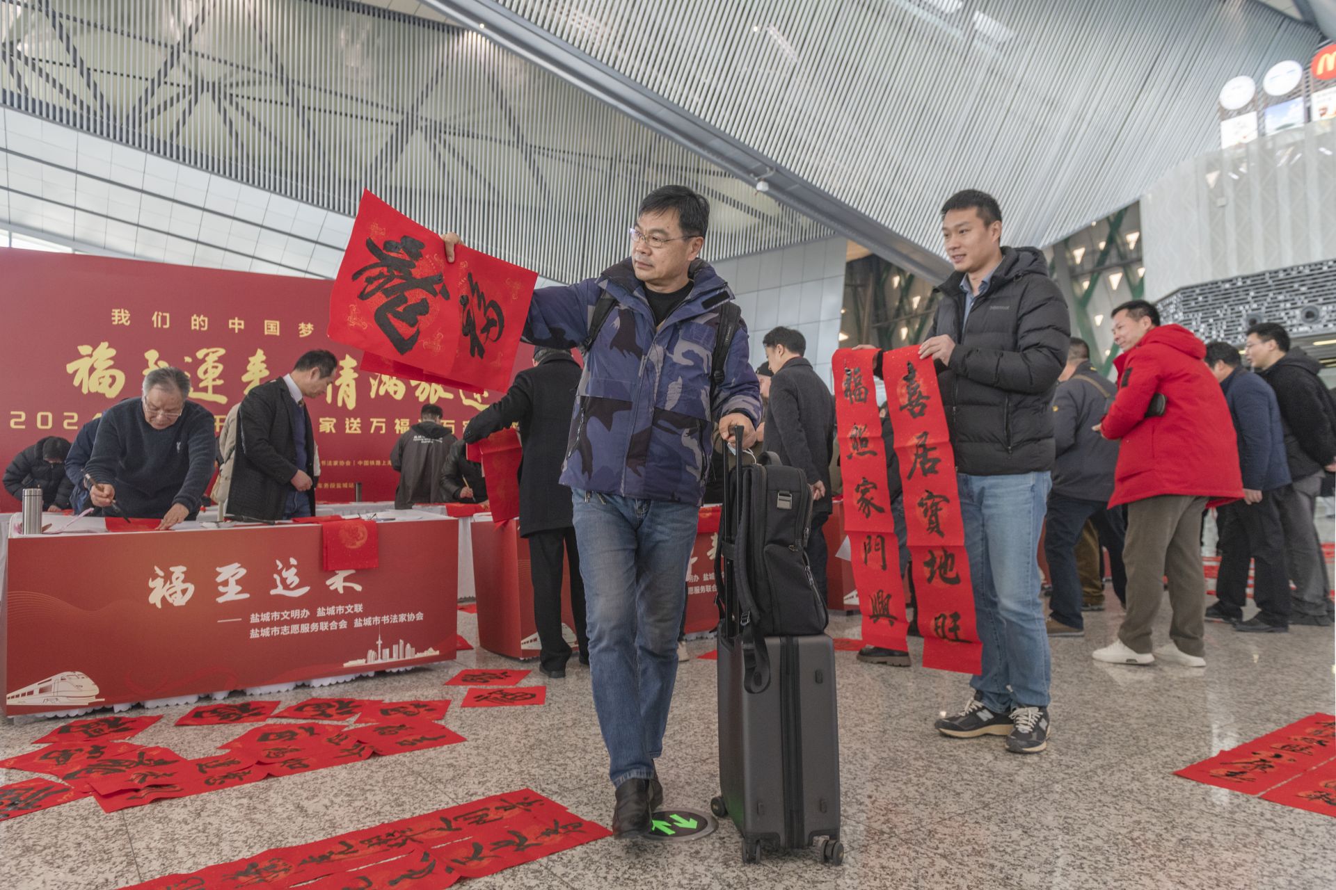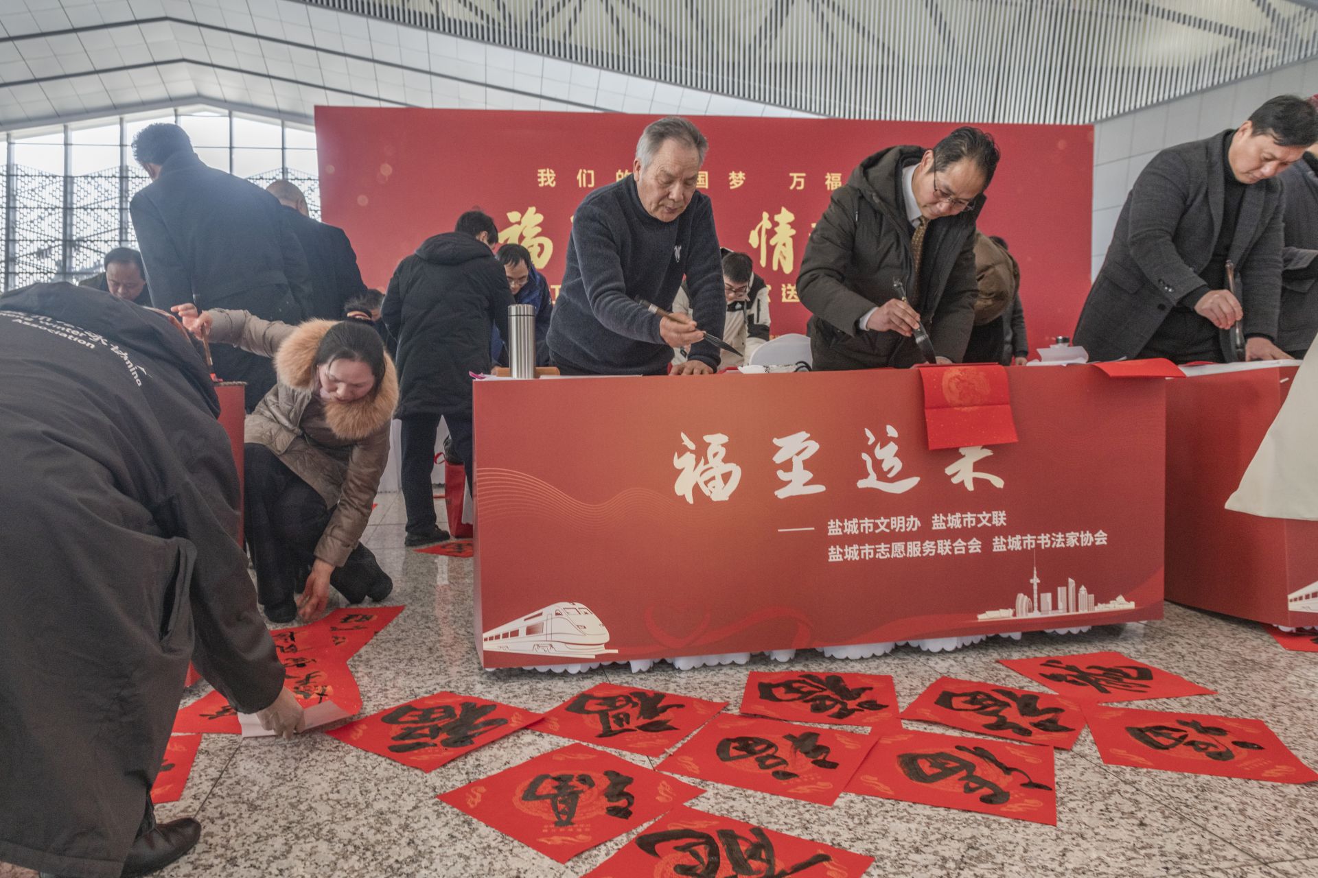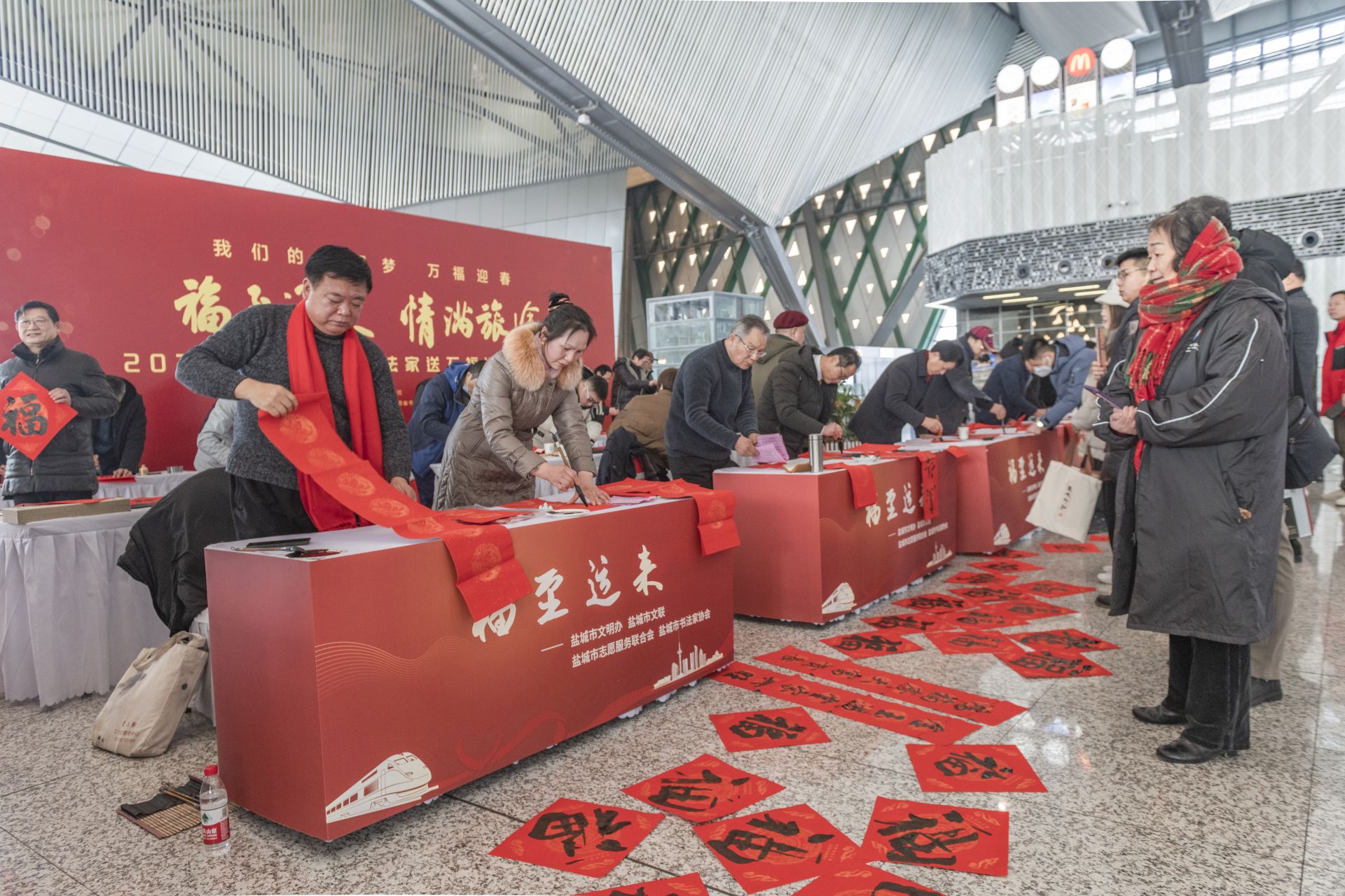 1月26日,春运首日,盐城高铁站内暖意融融。由江苏省文联、江苏省书法家协会等联合主办,铁路盐城站、盐城市书法家协会共同承办,“福至运来 情满旅途——2024江苏省千名书法家送万福进万家活动”盐城分会场送福活动在盐城高铁站举行。市书法家协会坚持为民惠民,多年来,持续在盐城高铁站和汽车客运站承办“福至运来”千名书法家送万福进千家万户活动,每年邀请全市近百名书法家为旅客书写春联及福字5000多幅,受到广大市民和旅客的一致好评。每个“福”字传递着春天信息,也带给旅客浓浓的喜气和年味。东台、大丰、阜宁南、建湖、射阳、响水、滨海7个高铁站同日举行活动。盐阜大众报报业集团融媒体记者 周晨阳 摄