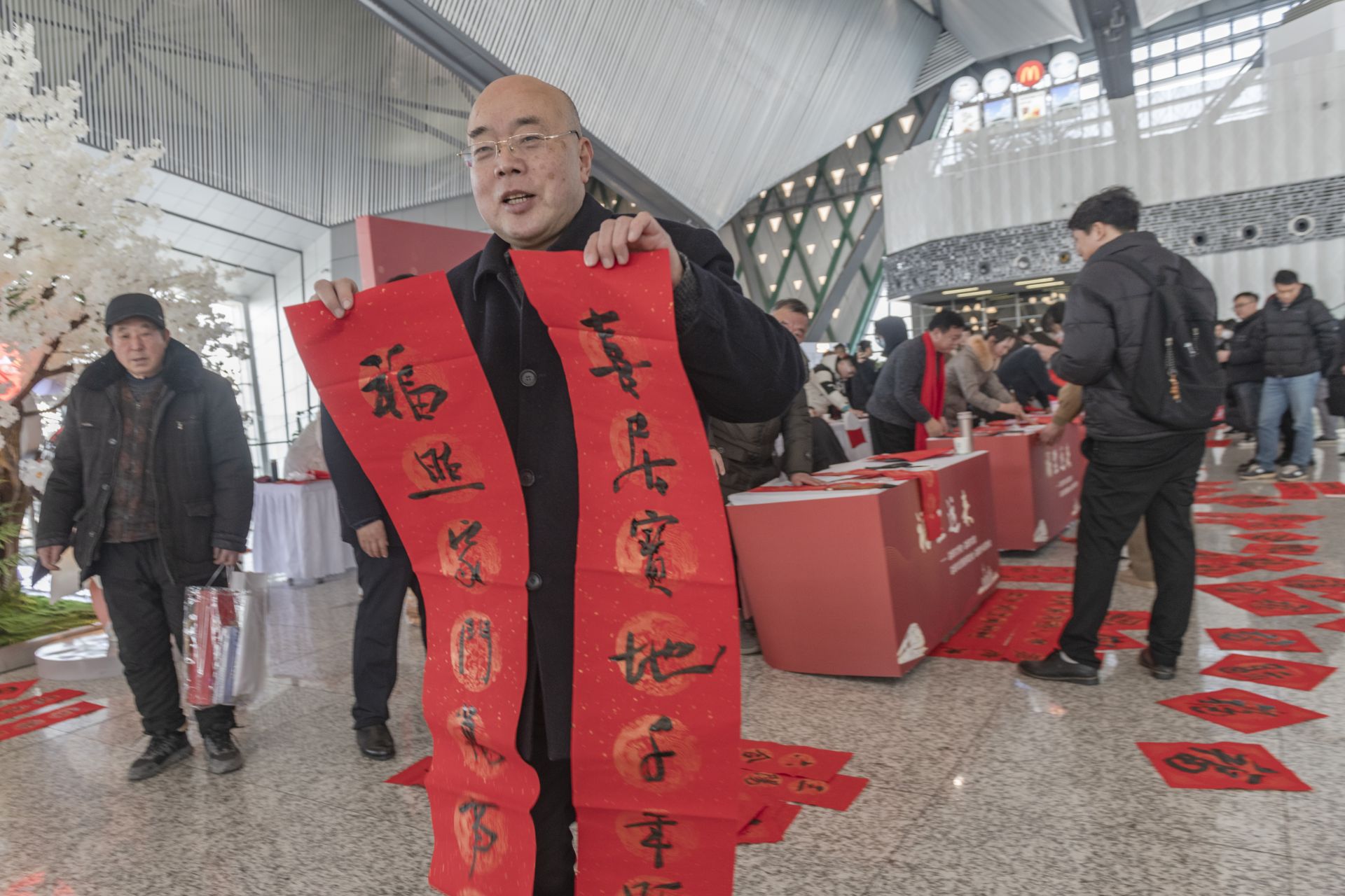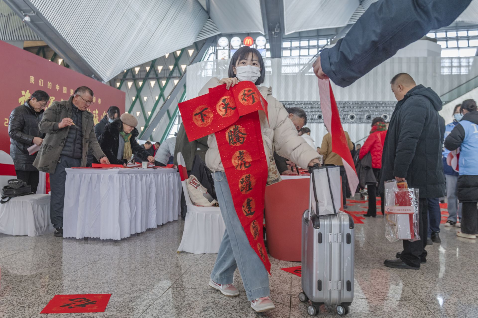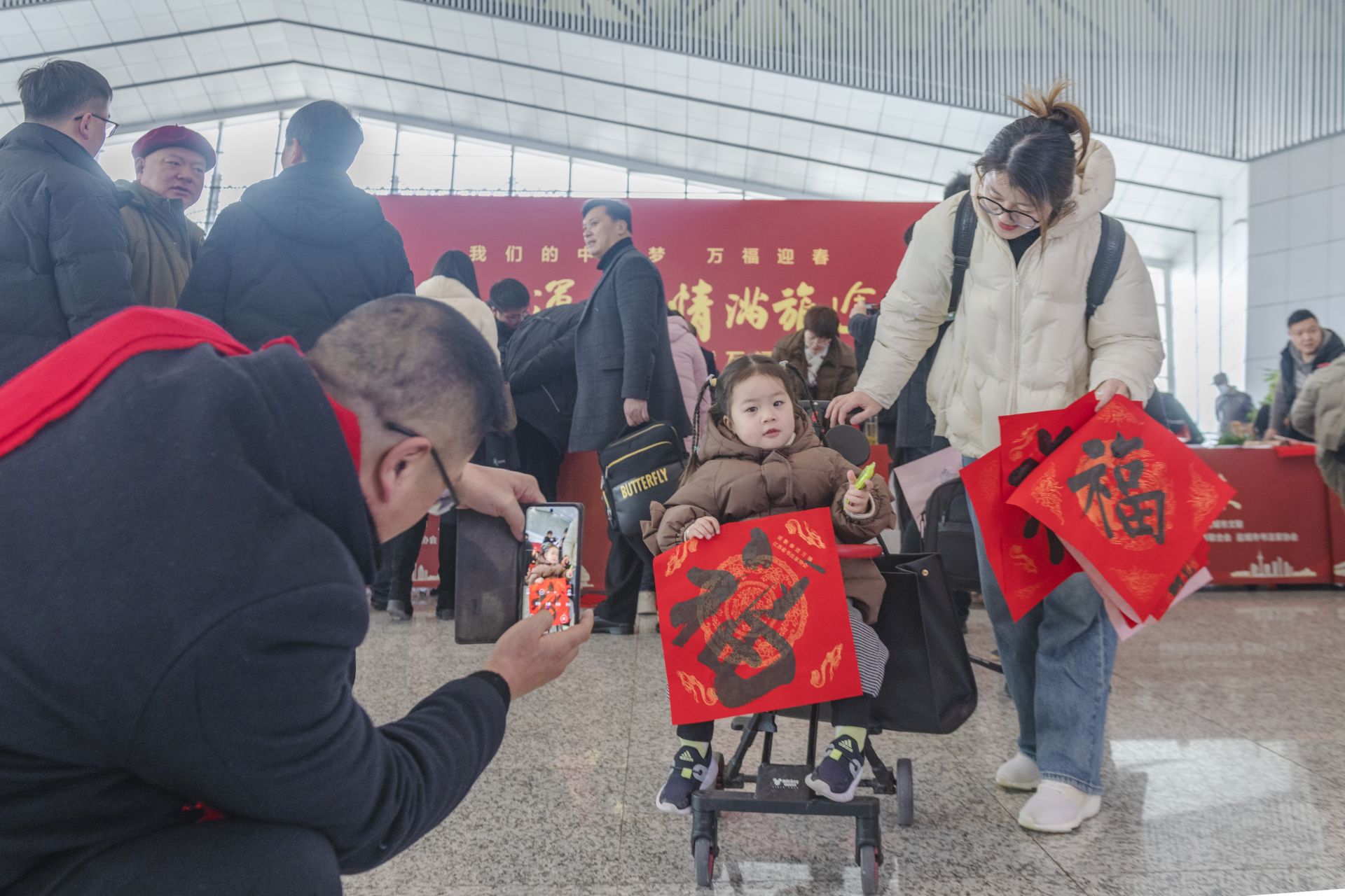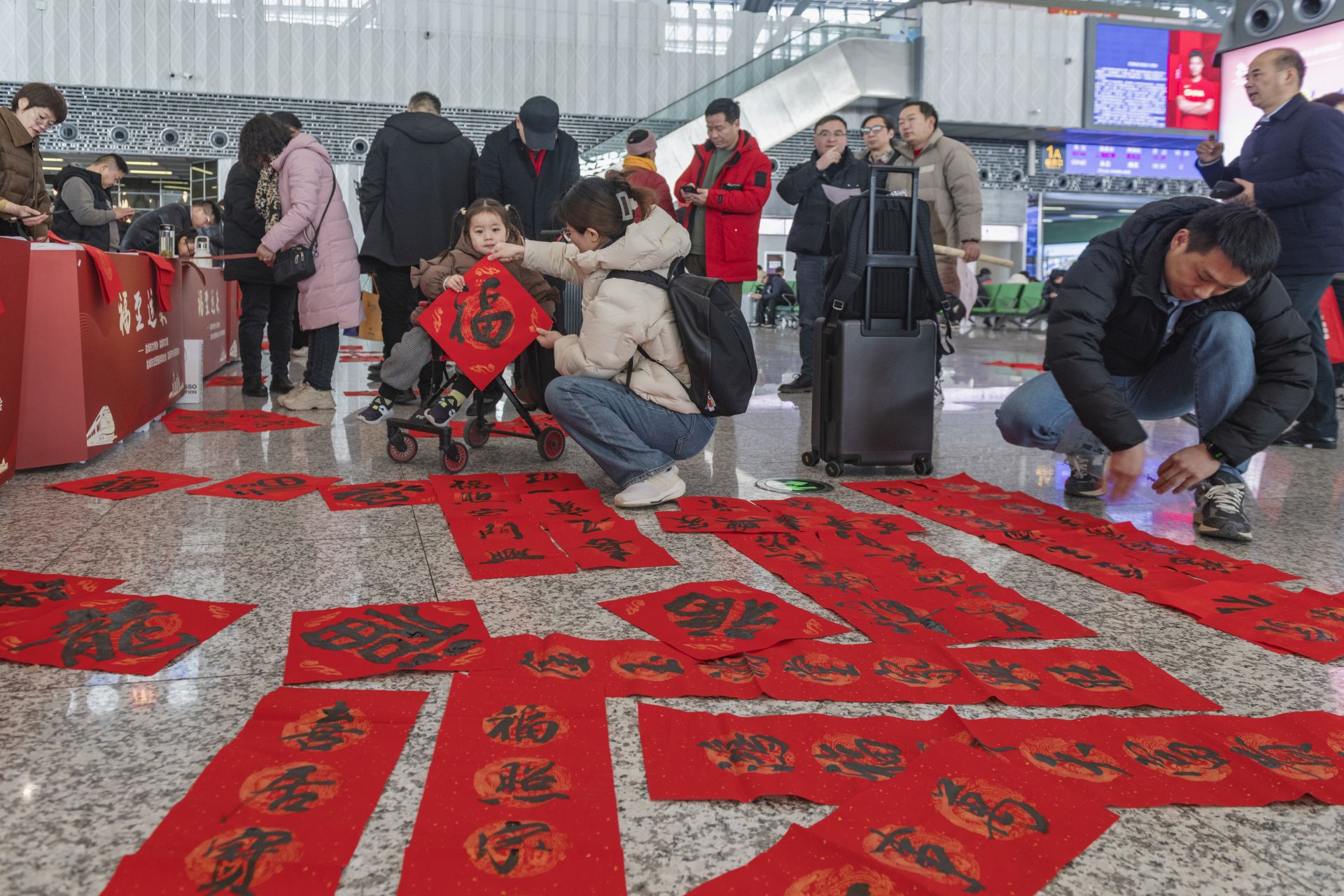 1月26日,春运首日,盐城高铁站内暖意融融。由江苏省文联、江苏省书法家协会等联合主办,铁路盐城站、盐城市书法家协会共同承办,“福至运来 情满旅途——2024江苏省千名书法家送万福进万家活动”盐城分会场送福活动在盐城高铁站举行。市书法家协会坚持为民惠民,多年来,持续在盐城高铁站和汽车客运站承办“福至运来”千名书法家送万福进千家万户活动,每年邀请全市近百名书法家为旅客书写春联及福字5000多幅,受到广大市民和旅客的一致好评。每个“福”字传递着春天信息,也带给旅客浓浓的喜气和年味。东台、大丰、阜宁南、建湖、射阳、响水、滨海7个高铁站同日举行活动。盐阜大众报报业集团融媒体记者 周晨阳 摄