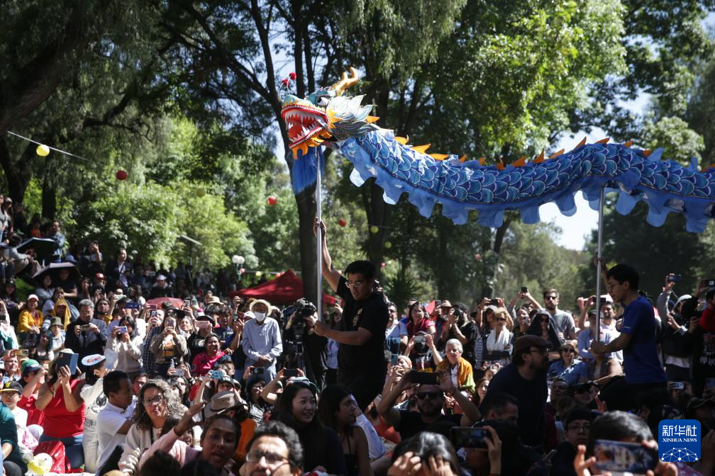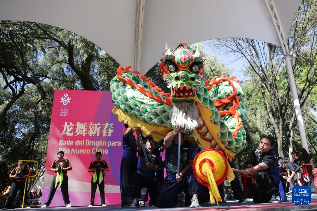 2月3日,演员在墨西哥首都墨西哥城国家艺术中心举行的第三届中国新年文化节上表演舞龙。新华社发(弗朗西斯科·卡涅多摄)