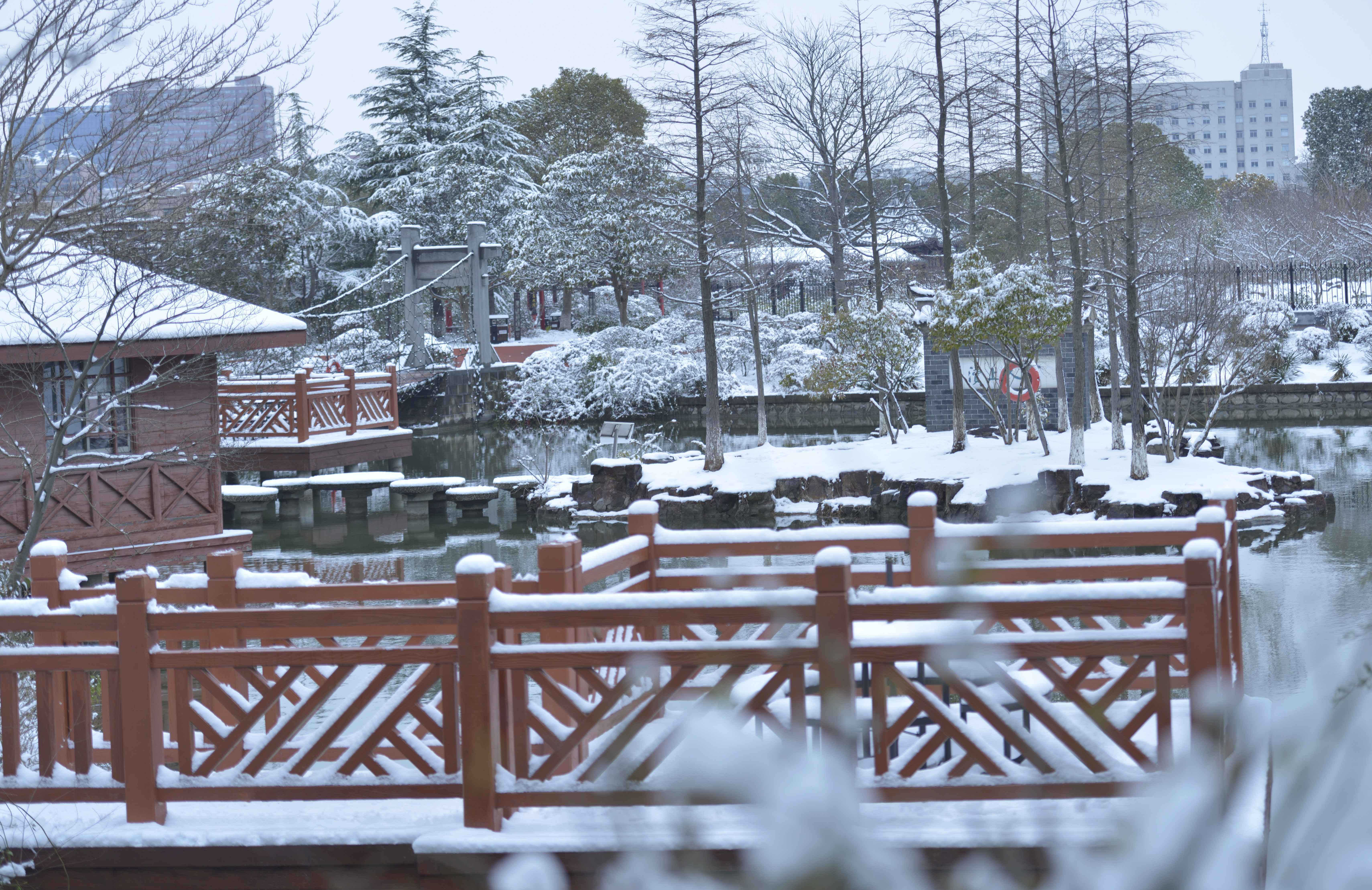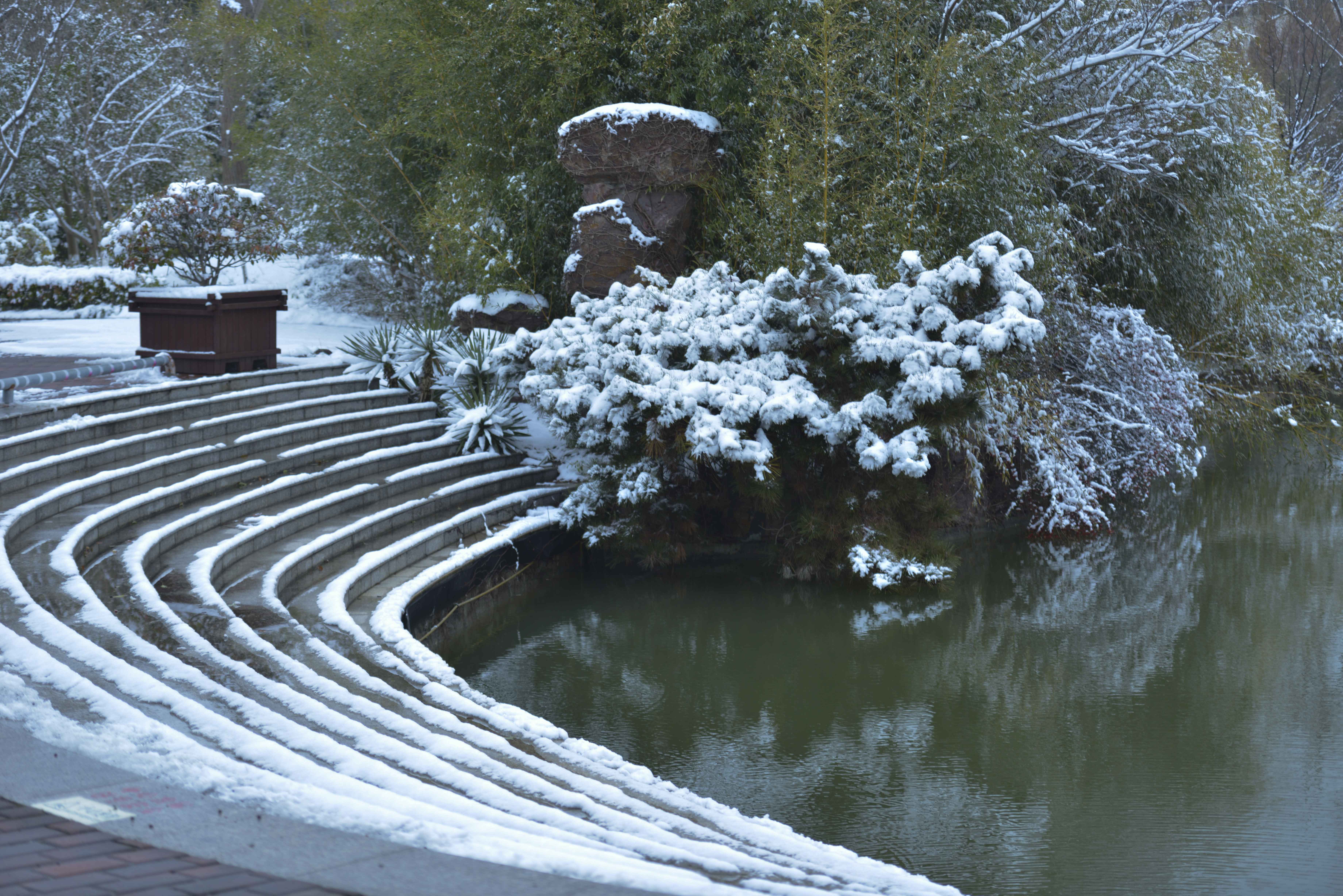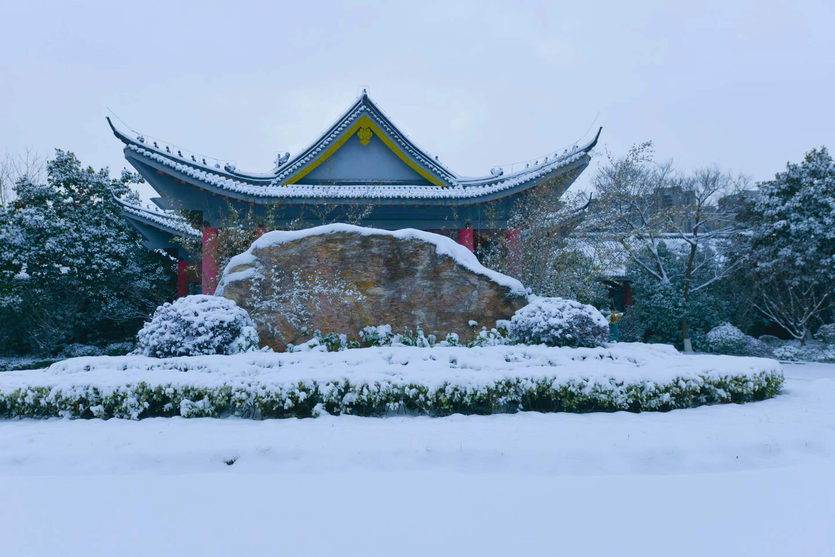 “白雪却嫌春色晚,故穿庭树作飞花。”一场雪,带来了世纪公园的别样风情。古树、楼阁、台阶、雕像、流水,在雪的点缀下,多了一份时光的沉淀,质朴的厚重。