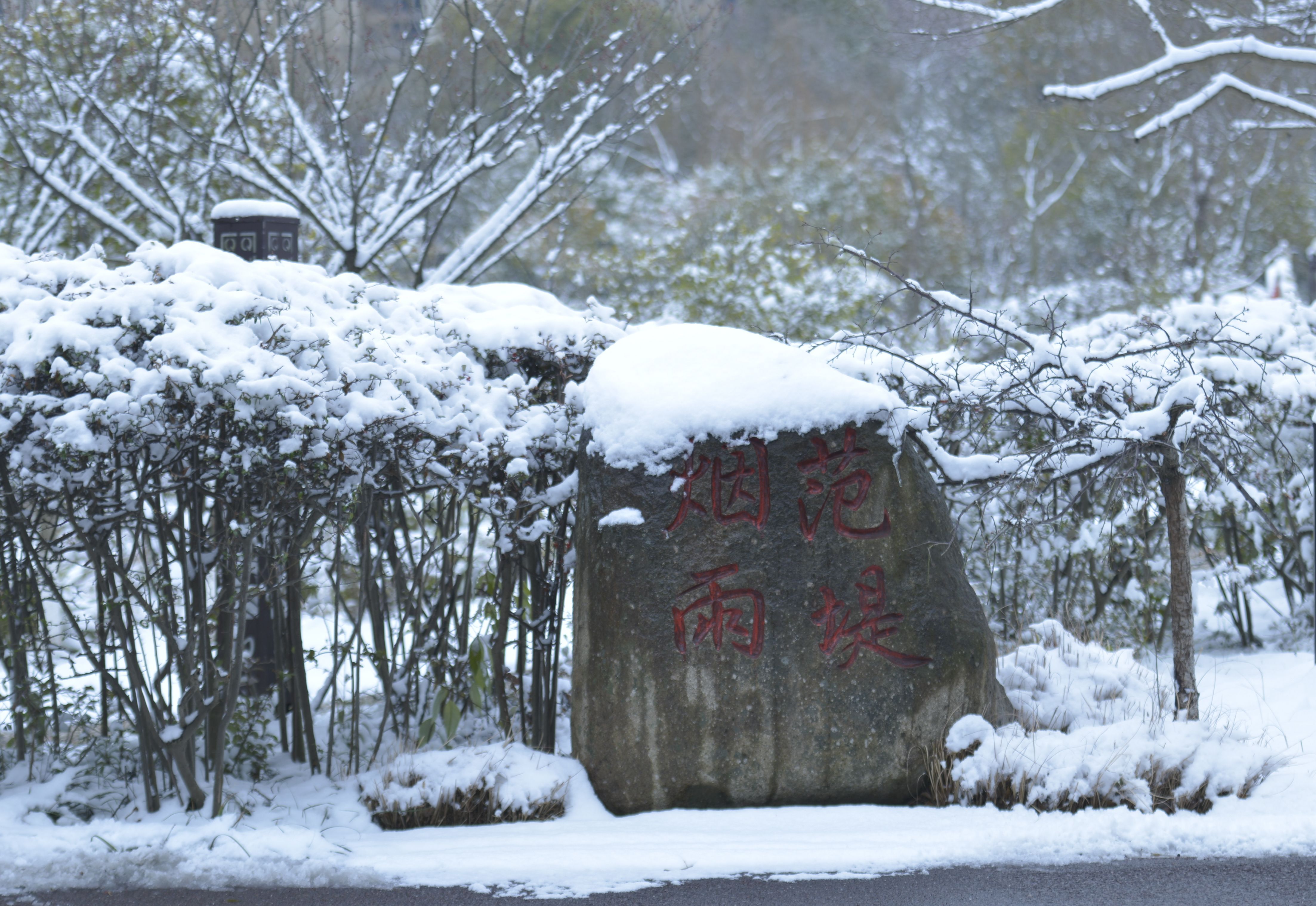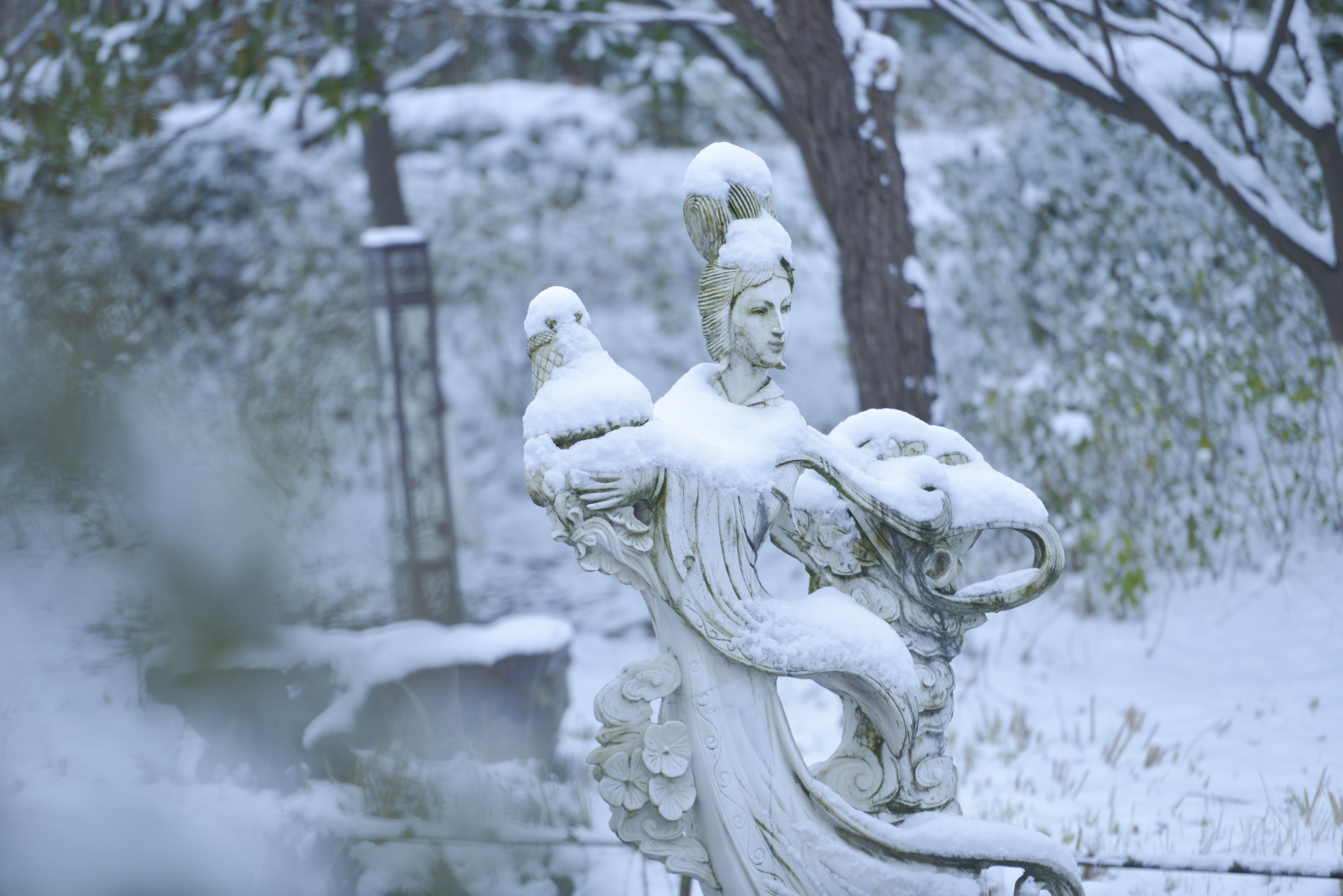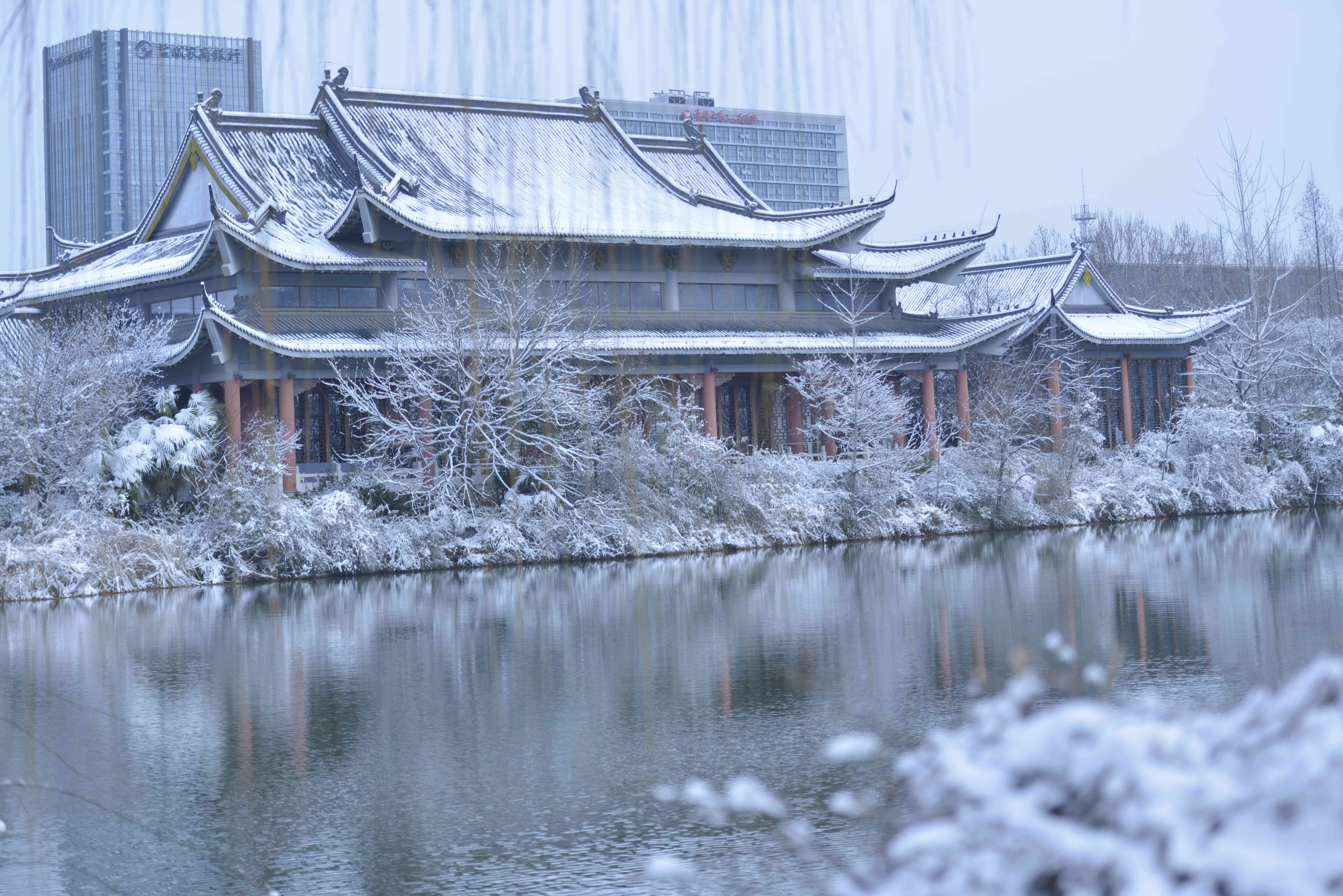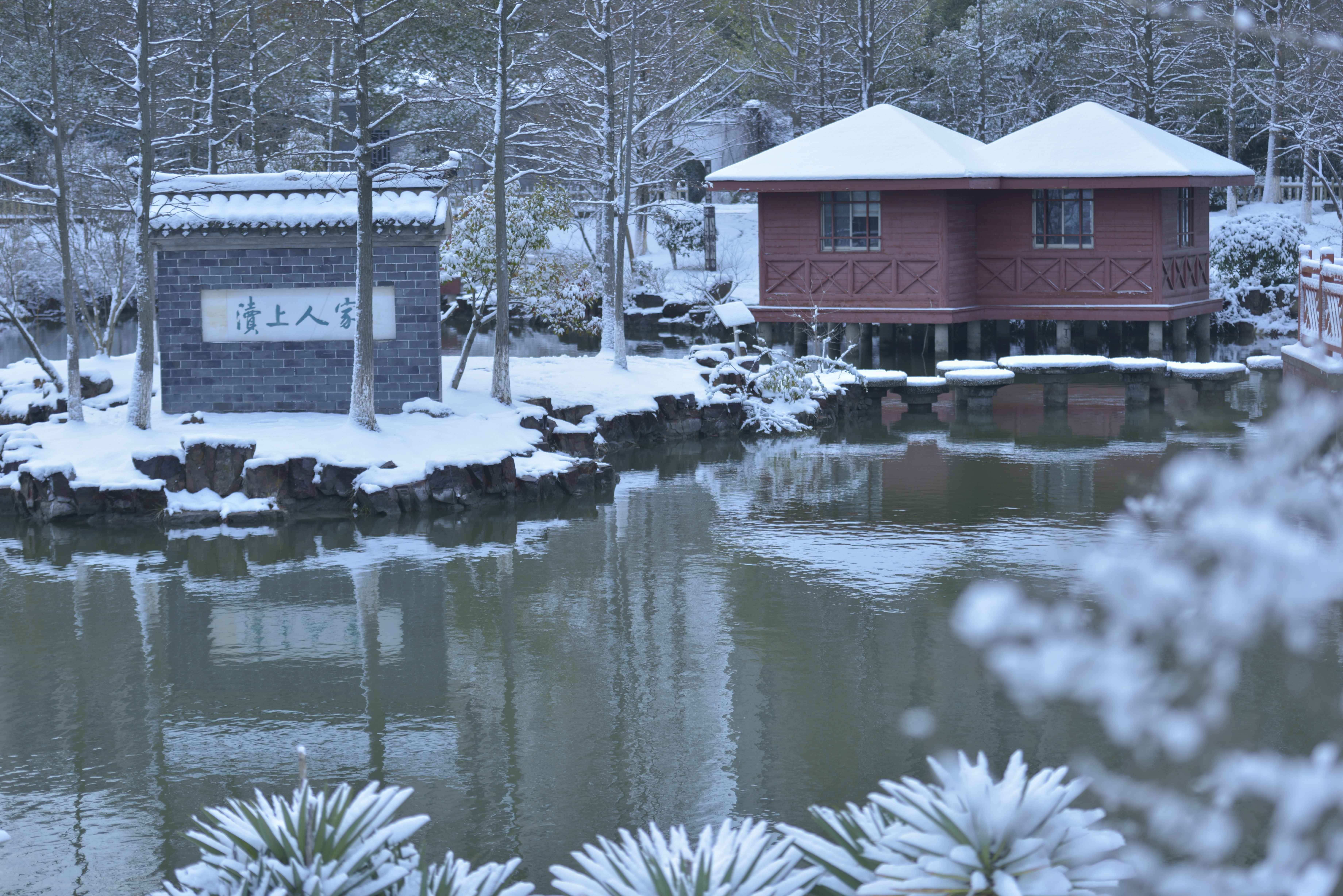 “白雪却嫌春色晚,故穿庭树作飞花。”一场雪,带来了世纪公园的别样风情。古树、楼阁、台阶、雕像、流水,在雪的点缀下,多了一份时光的沉淀,质朴的厚重。