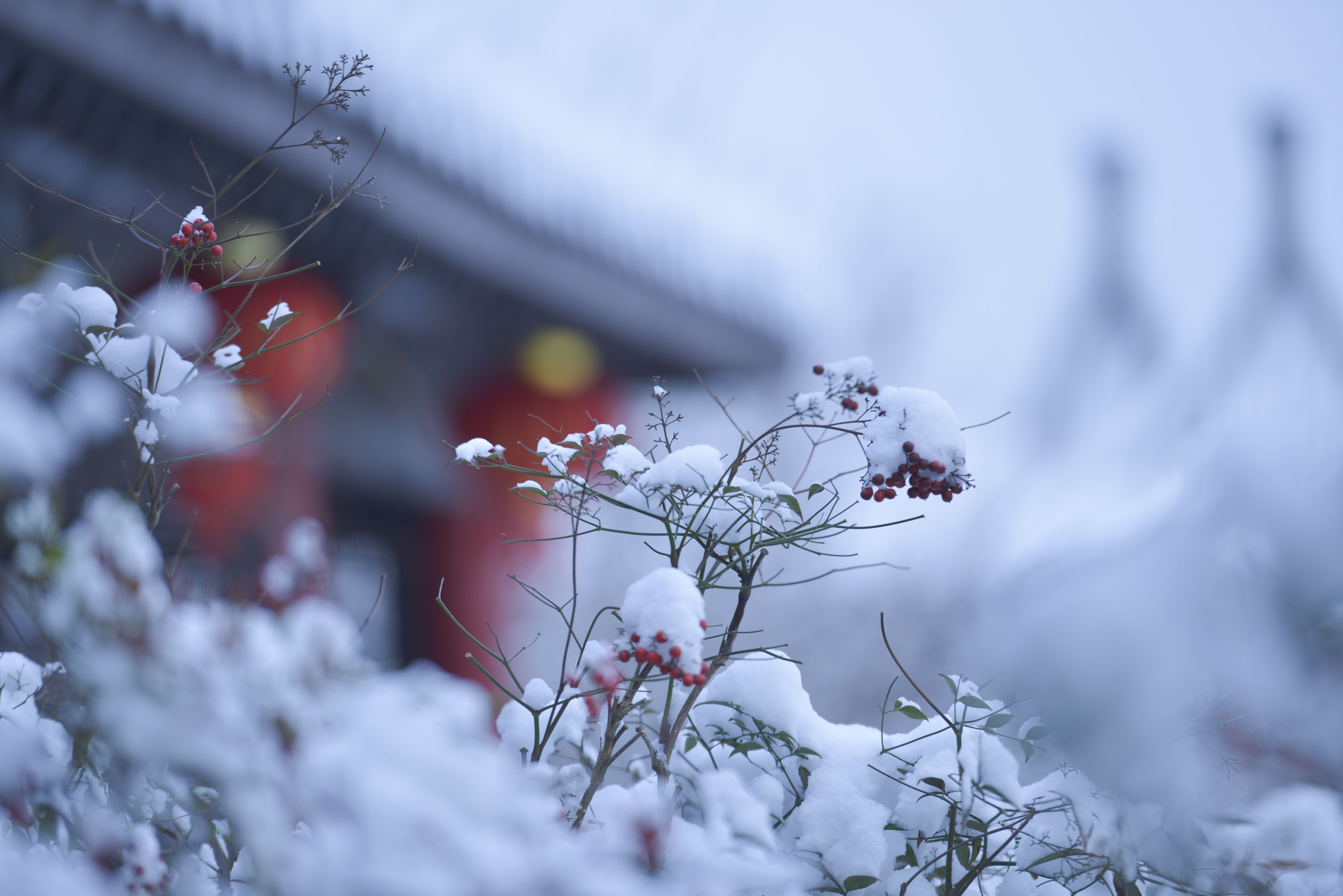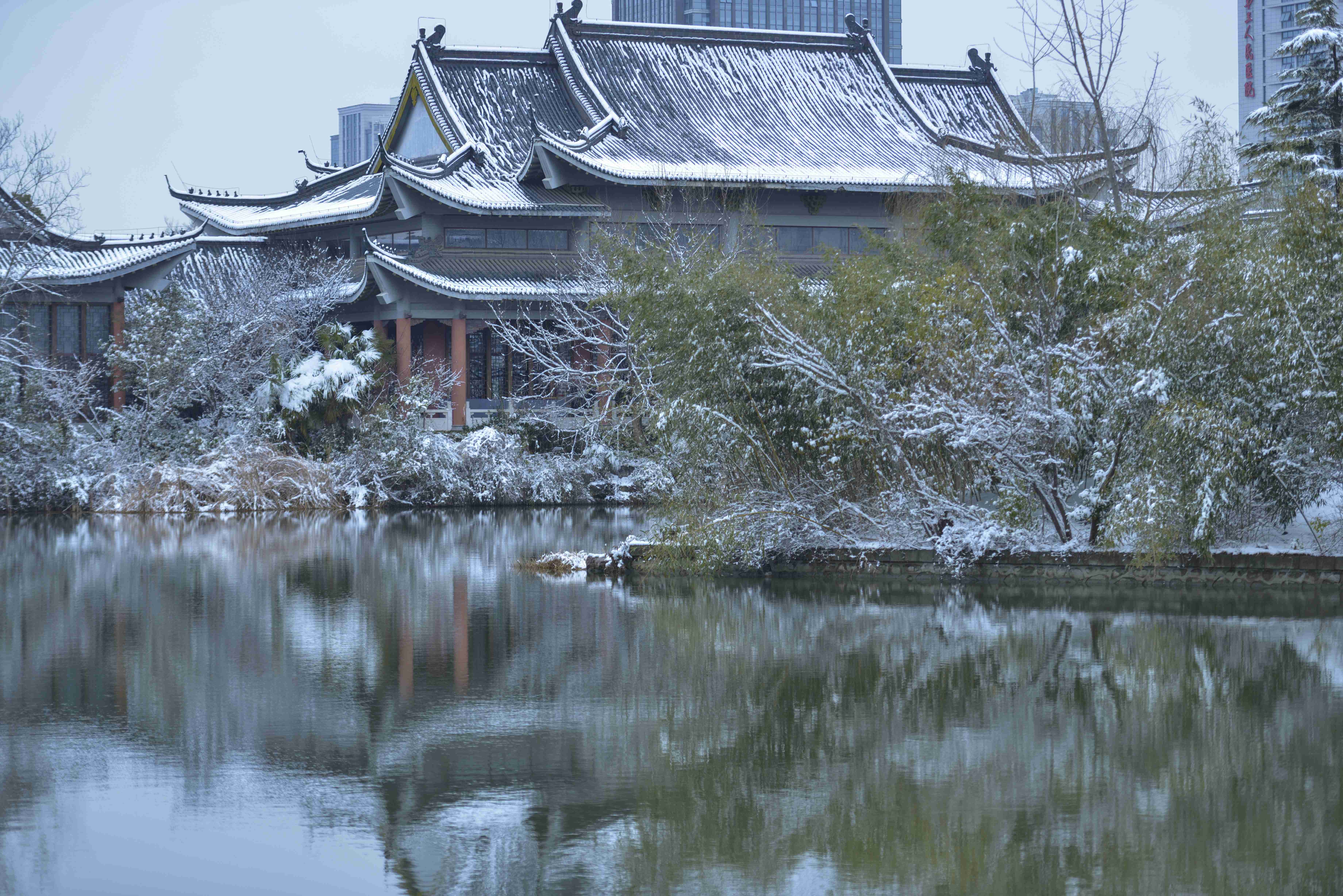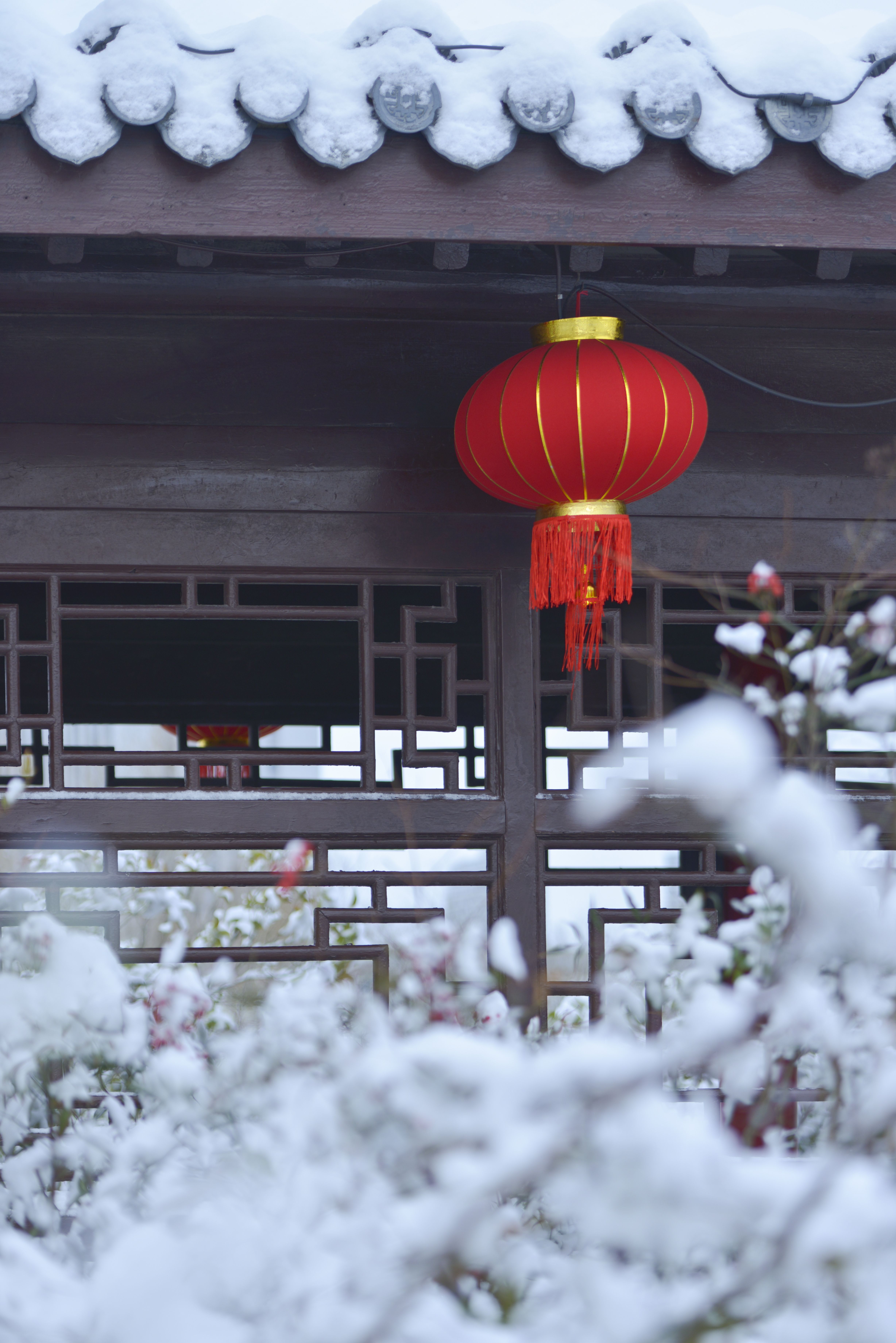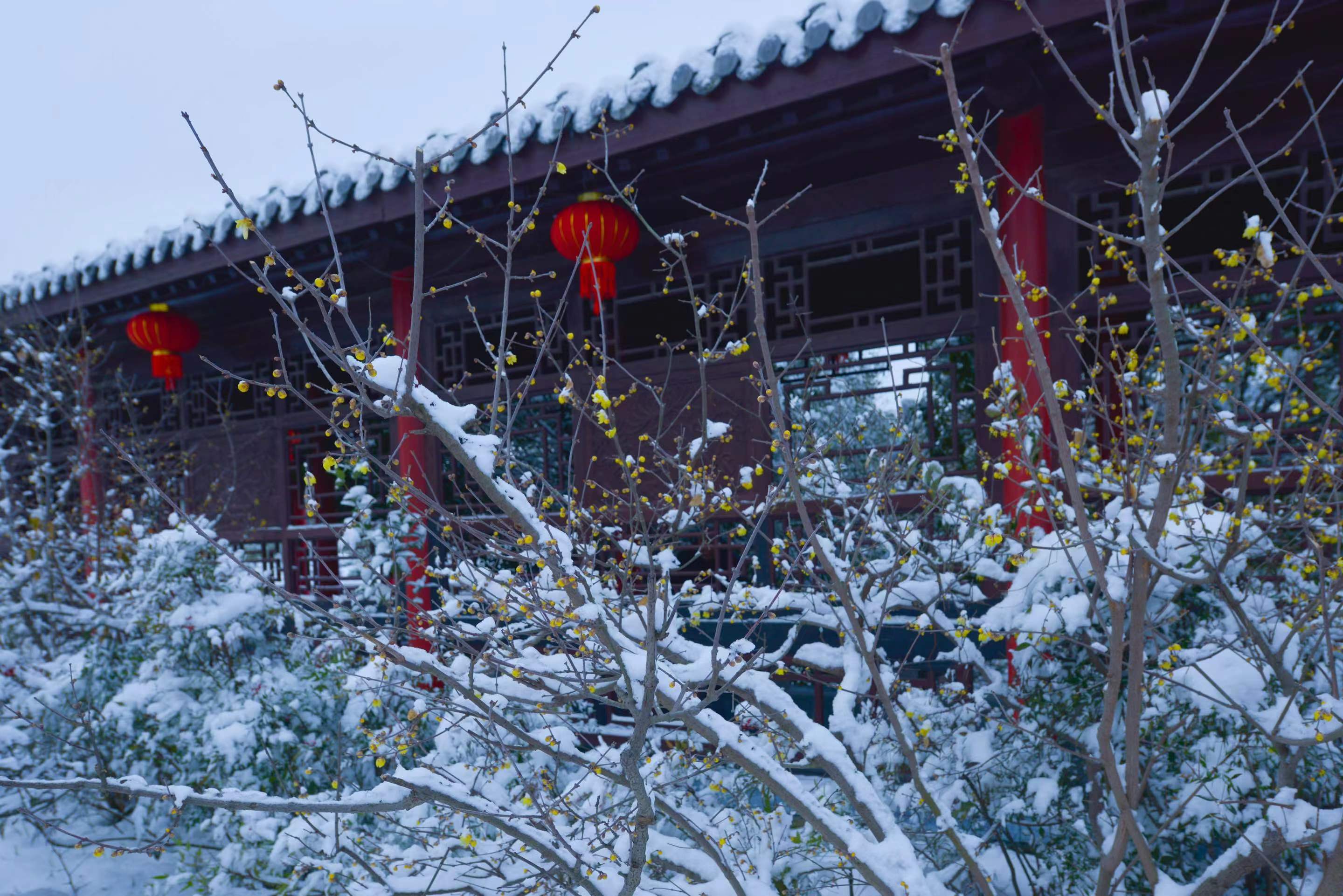 雪后的世纪公园,恰似一场时光穿越,古典雅韵,深情款款,如梦如幻。雪落枝头成诗,蜡梅印雪成画,此时的古典建筑、飞檐、黛瓦、雅竹、红灯笼,宛若一幅水墨画卷,尽显盐都秀丽。