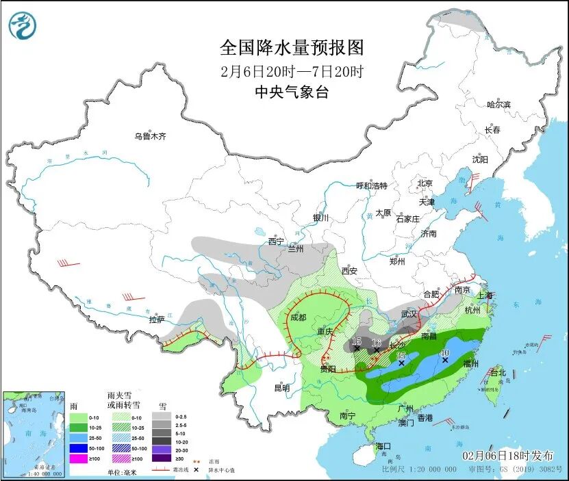 6日20时至7日20时,黑龙江西北部、西藏东部、西北地区中东部、西南地区东部、湖北西部和南部、湖南中北部、江西北部、安徽南部、浙江北部等地部分地区有小到中雪或雨夹雪,其中,湖南中北部、江西西北部、贵州东北部等地部分地区有大到暴雪。贵州中部、湖南中南部以及江西西北部、浙江中西部山区等地的部分地区有冻雨。