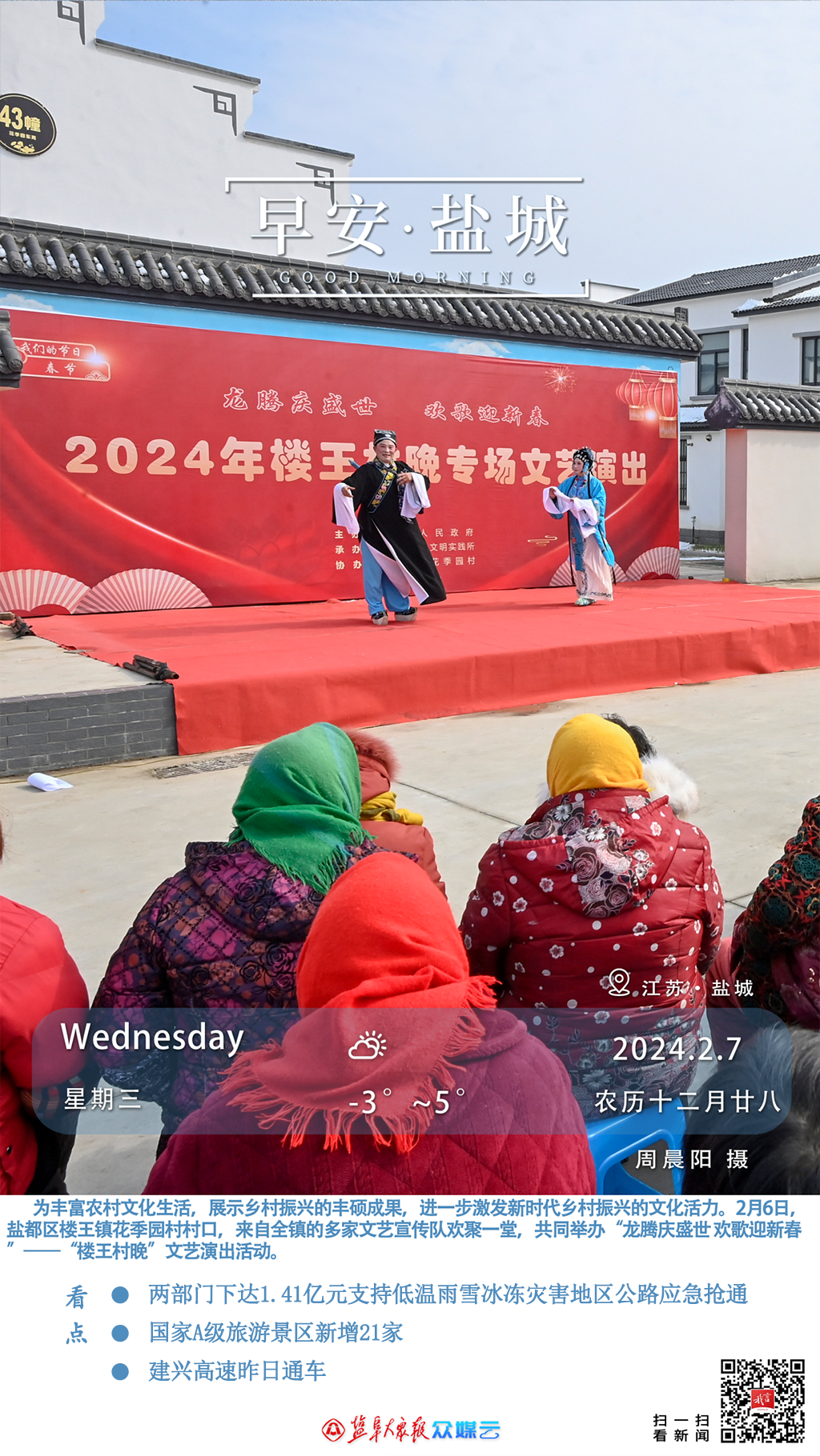 读者朋友,早上好!今天是2024年2月7日,星期三,癸卯年腊月廿八。今天多云,北风转西北风1级。预计今天最高气温5℃。