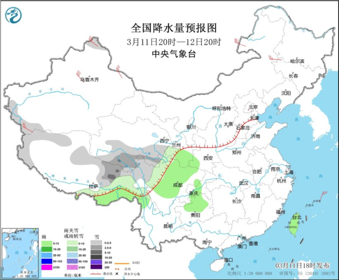 3月11日20时至12日20时,新疆北疆北部和南疆西南部、西藏北部和东部、青海东部和南部、川西高原北部等地部分地区有小雪或雨夹雪,其中,西藏东部、青海南部等地部分地区有中到大雪。西藏东南部、甘肃东南部、陕西南部、四川盆地西部、重庆中西部、贵州中北部、台湾岛等地部分地区有小雨。