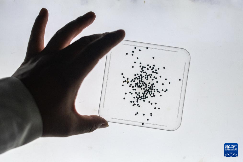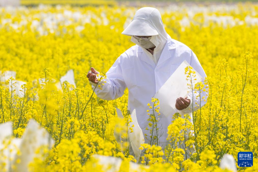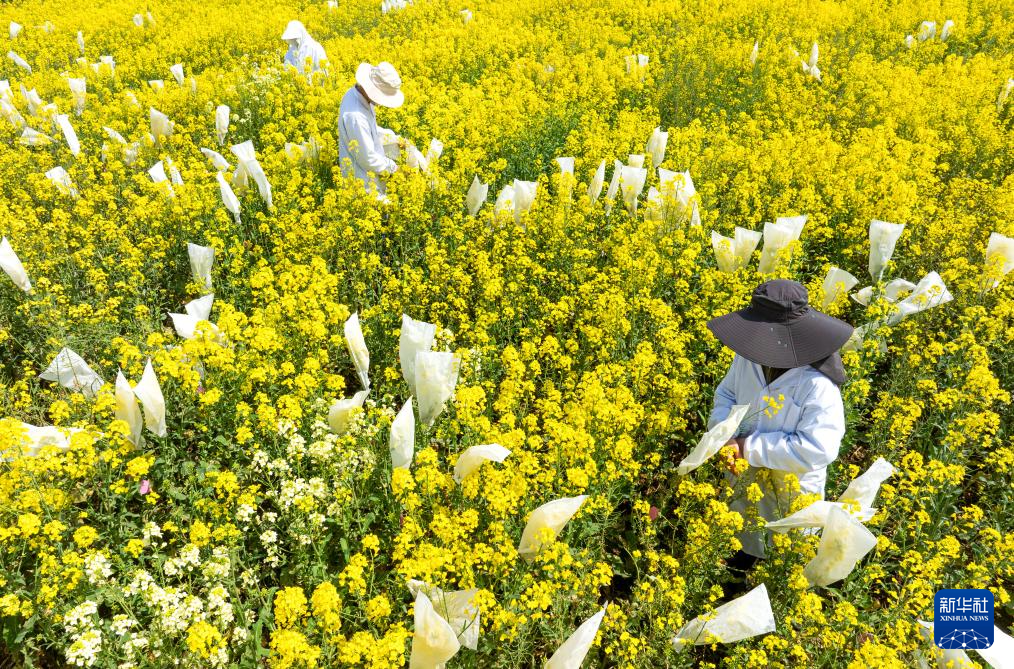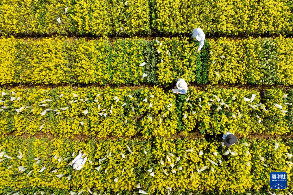 3月20日,在中国农科院油料所阳逻基地千亩油菜试验田,油菜遗传育种创新团队成员为油菜花朵套袋(无人机照片)。观察记录、元素测定、考种成像……在位于武汉市的中国农业科学院油料作物研究所(简称油料所),油菜遗传育种创新团队的成员正紧张地进行油菜品种选育、油菜多功能开发利用等工作。近年来,随着一系列育种新技术、新装备应用,育种创新逐渐变成一个相对可控、可预期的过程,一批批油菜新品种被选育出来。2023年,中国工程院院士、油菜遗传育种团队首席专家王汉中带领团队培育出短生育期油菜新品种“中油早1号”,将油菜生育期从通常的190天缩短到约169天。在“油菜设计师”们不懈的努力下,一粒粒种子逐渐开成一片片油菜花海。新华社记者 肖艺九 摄