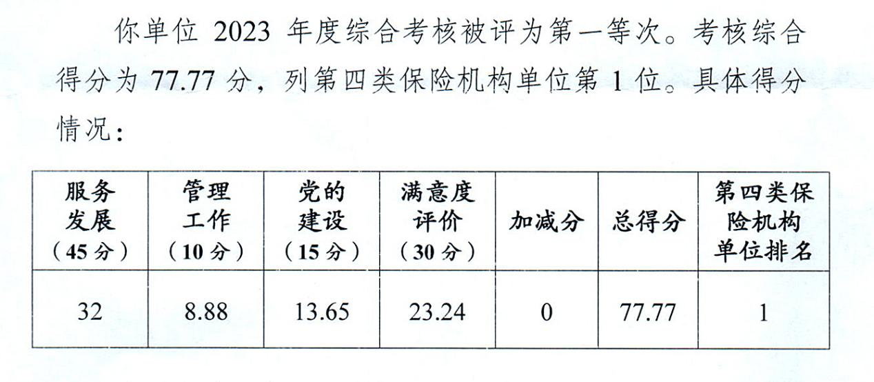 近日,盐城市委、市政府召开全市2023年度高质量发展总结暨机关作风建设推进会议,会上通报了2023年度全市综合考核结果,人保财险盐城市分公司荣获2023年度综合考核第一等次,考核综合得分为77.77分,位列第四类保险机构单位第一,这也是盐城人保财险连续5年获得同类殊荣。