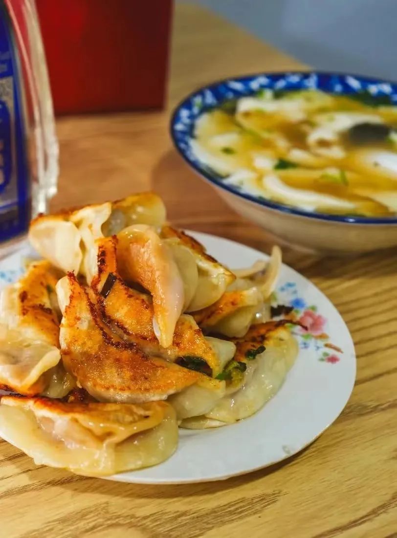 甜咸甜咸的鲜肉锅贴,下面有层焦黄的脆壳,蘸醋和辣椒吃,一份10元16只锅贴满满一大碗都吃不够,因为实在太香了。
