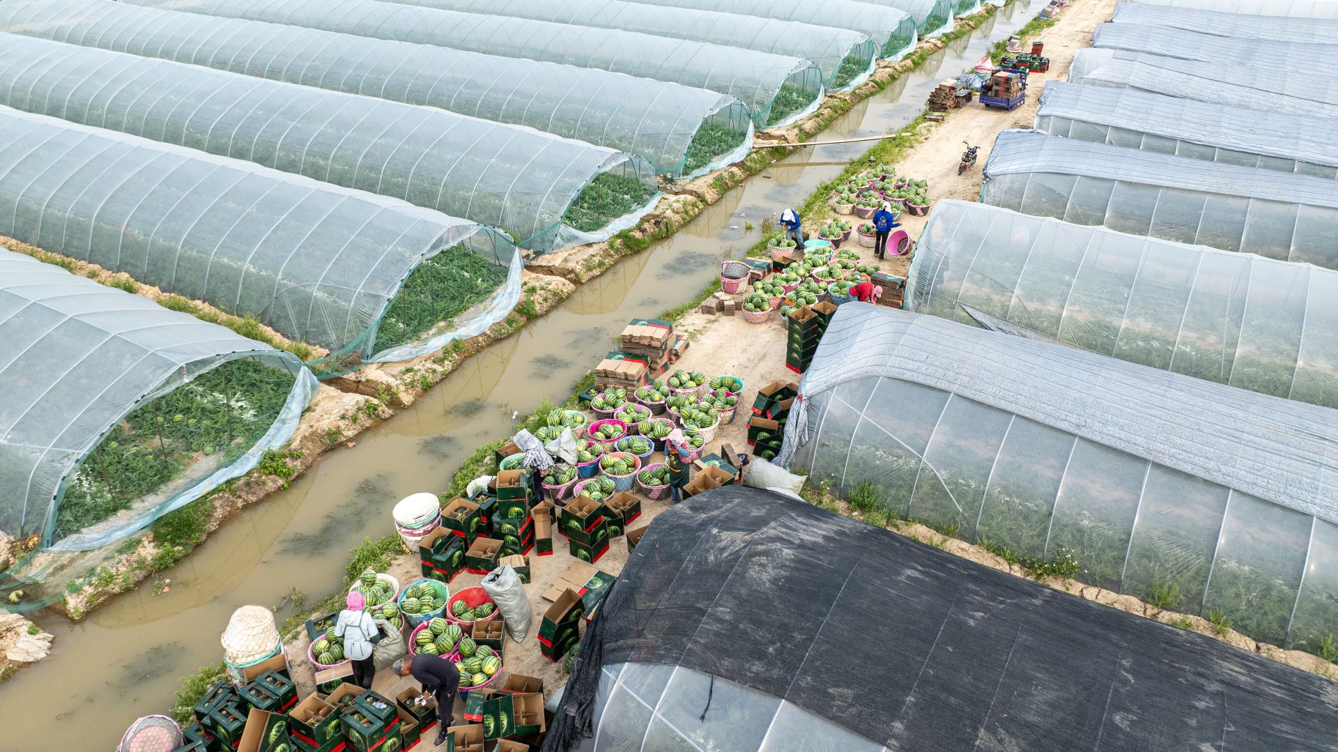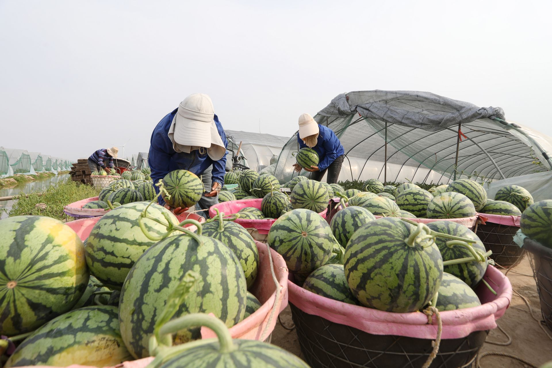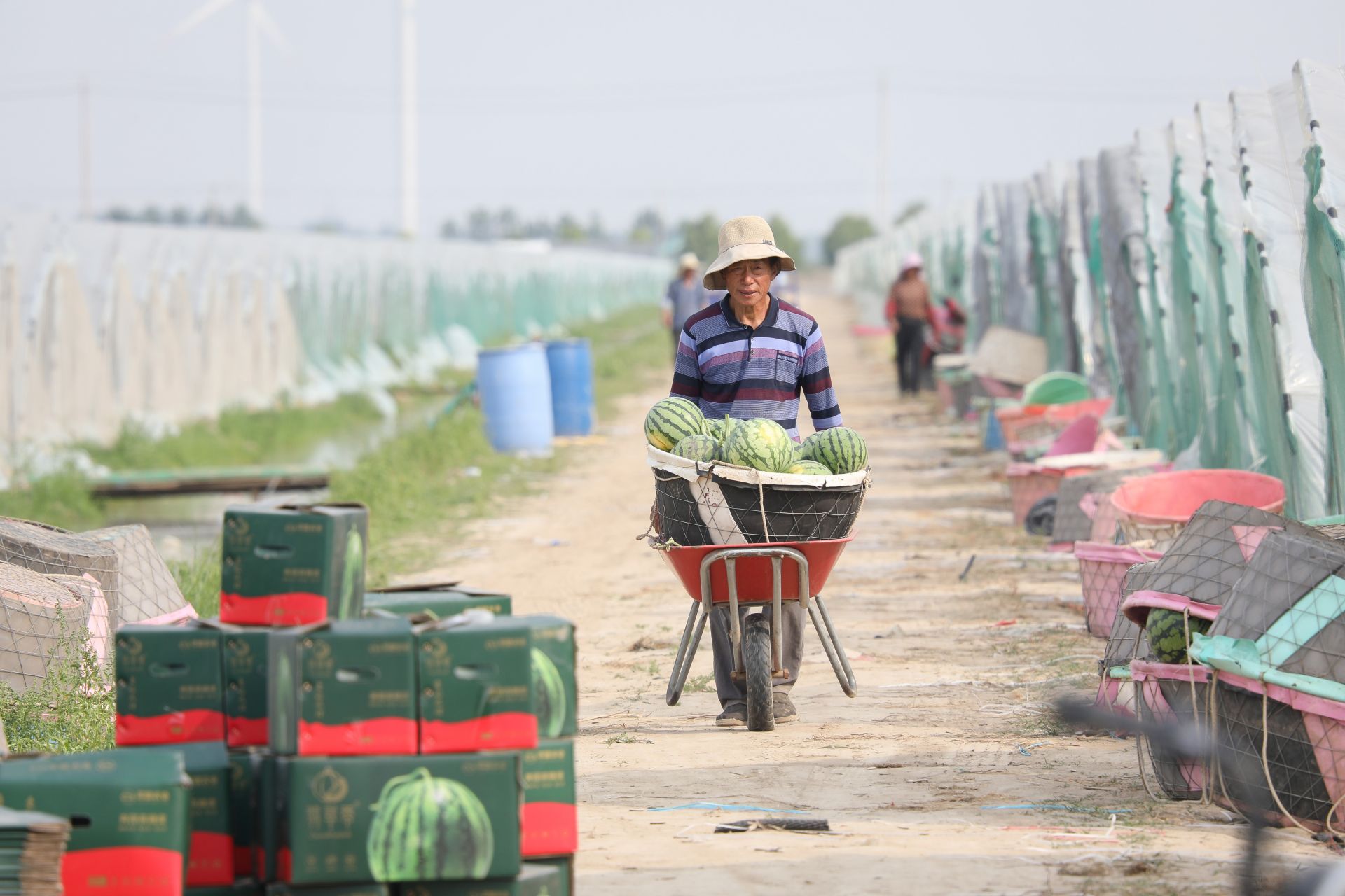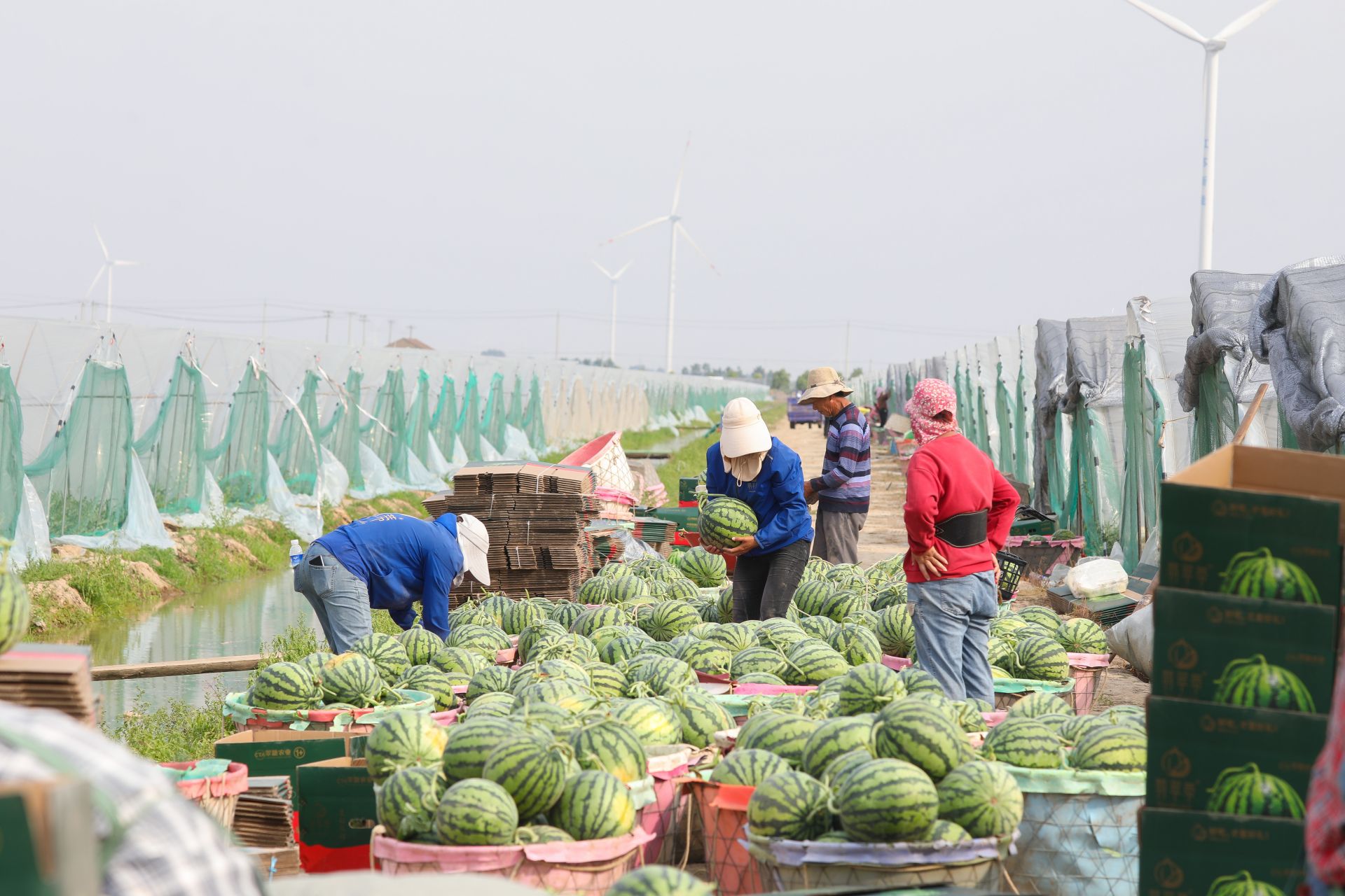 图为该县兴桥镇一处西瓜大棚,工人们正忙着采摘、装车,一派丰收的繁忙景象。 盐阜大众报报业集团融媒体记者 杨毅 通讯员 彭岭 摄(一审:韩昕栩丨二审:李艳丨三审:张伟伟)