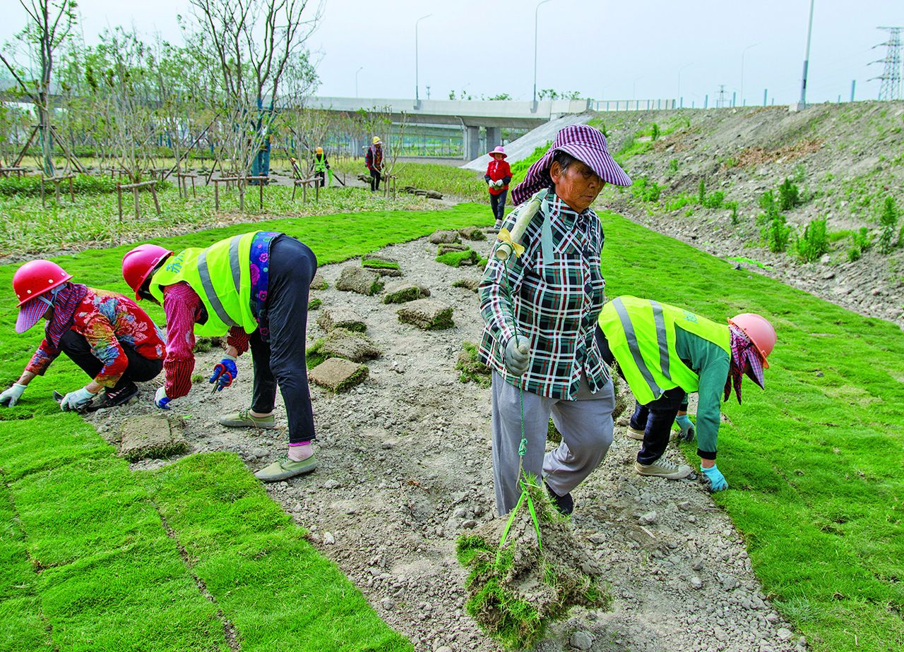 绿化施工人员在枢纽区铺设草皮。盐阜大众报报业集团融媒体通讯员 顾枫 摄
