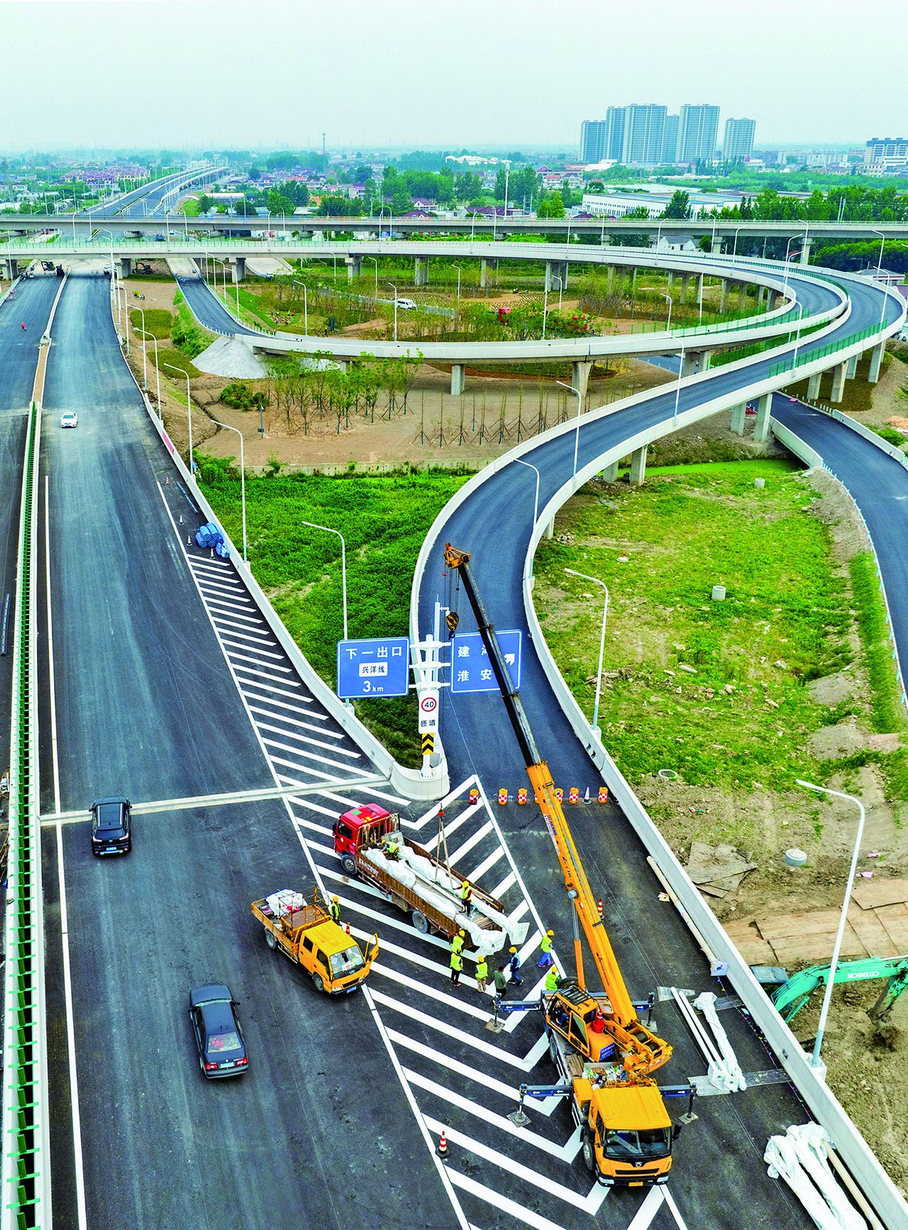连日来,在盐阜快速通道项目现场,工人们抢抓雨季来临前的晴好时机,抓紧推进交安、绿化等项目附属工程施工。盐阜快速通道连接盐城市区与阜宁县城,是204国道的重要组成部分,也是国家“五纵”运输通道中沿海综合运输通道的关键路段,全长41.4公里,快车道设计时速100公里,全程无红绿灯。 图为安装交通标志标牌。盐阜大众报报业集团融媒体通讯员 顾枫 摄