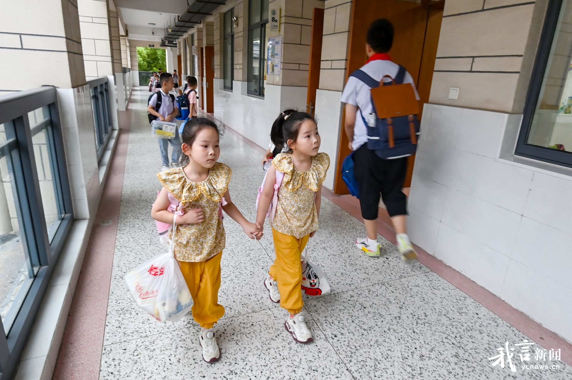 一对双胞胎认真寻找自己的班级。盐阜大众报报业集团融媒体记者 郜野乔 王焱 摄