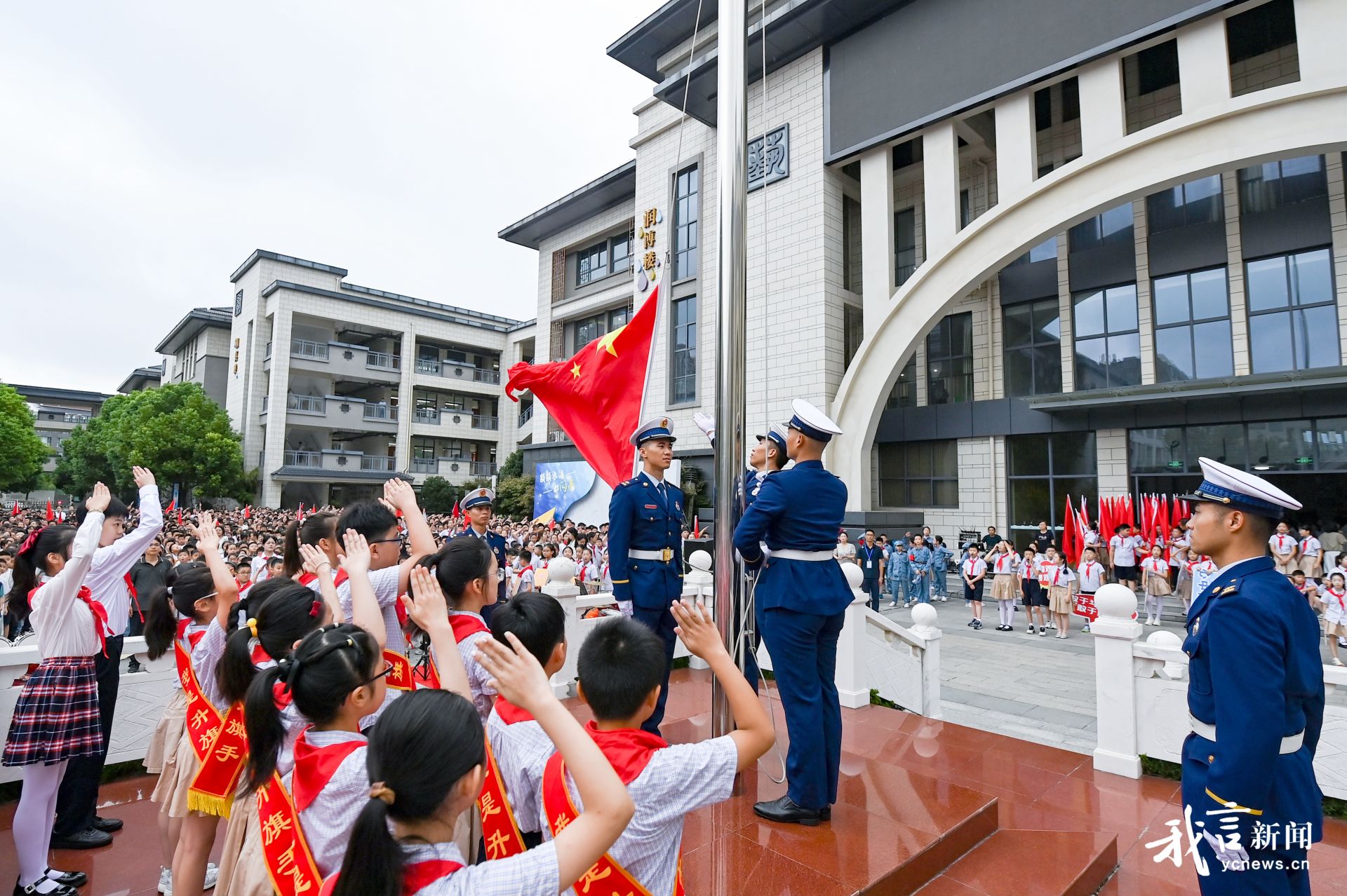 9月2日是全市秋季开学第一天,刚入学的懵懂、对假期的不舍、久别相聚的欢笑……这一幕幕场景在校园里轮番上演,不少学校也精心准备了开学第一课和隆重的升国旗仪式,和孩子们一起迎接新学期的到来。图为串场河小学邀请了消防官兵,和孩子们一起举行升旗仪式。盐阜大众报报业集团融媒体记者 郜野乔 王焱 摄
