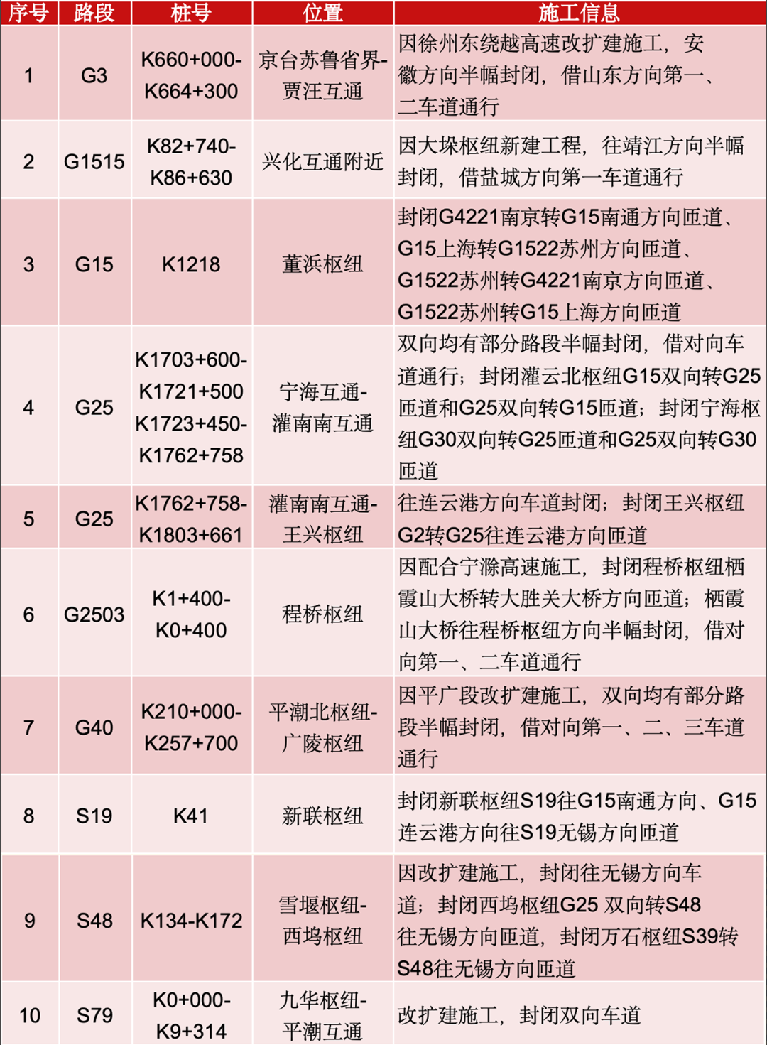 G15沈海高速连云港西双方向,S49新扬高速陈集、刘集收费站往扬州方向入口临时关闭。0110个服务区因充电设施少易繁忙