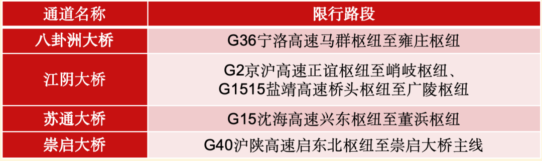 返程期间,八卦洲大桥、江阴大桥、苏通大桥、崇启大桥实施黄牌货车限时错峰出行政策,限行时段为10月6日、7日每日8时-22时。