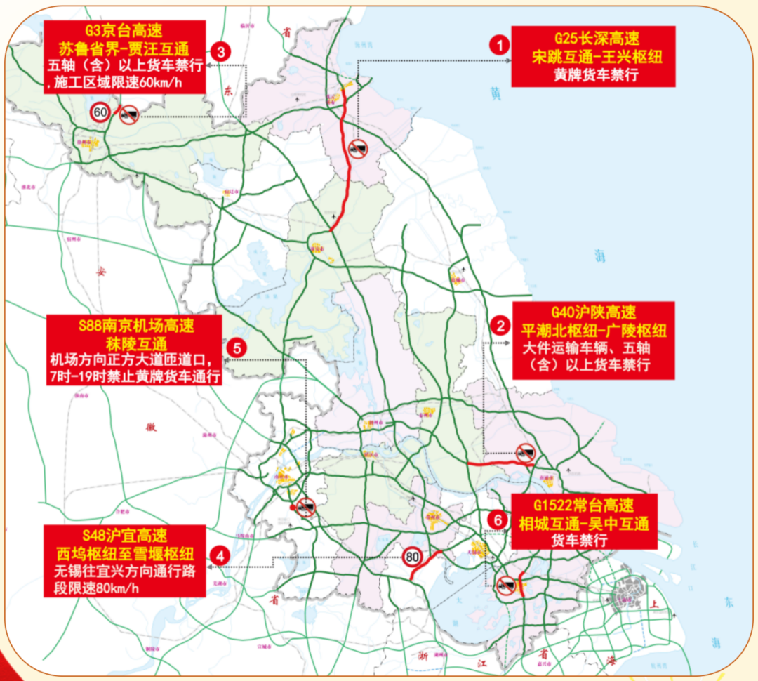 返程期间,江苏高速对危化品运输车全路网全时段禁行。部分重要路段、节点实施交通管制政策,相关车辆假日期间请勿驶入限行路段。