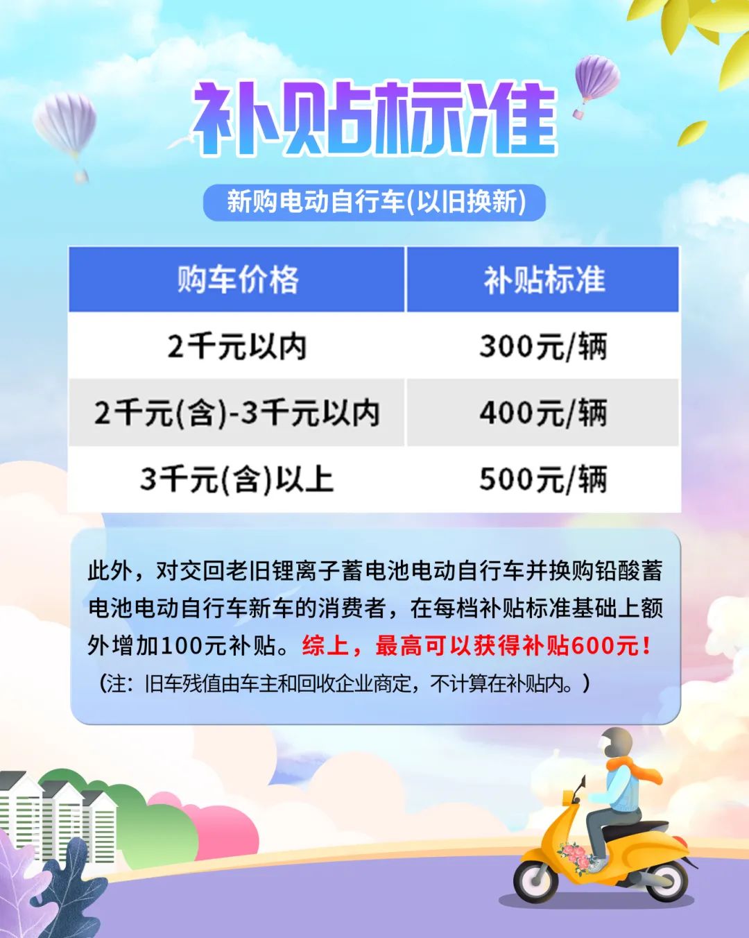 补贴标准按照新购电动自行车价格(含税价)分档实施。其中,新购电动自行车价格在2000元(不含)以下的补贴300元,价格在2000元(含)至3000元(不含)的补贴400元,价格在3000元(含)以上的补贴500元。