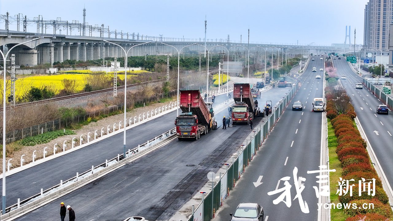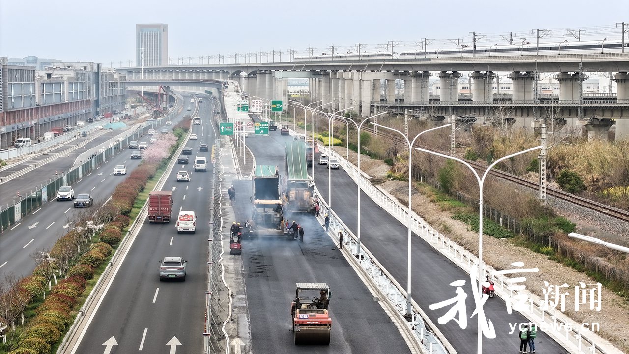 3月29日上午,市区范公路辅道改造东侧高架匝道口,一台台铺路机正在进行沥青摊铺。