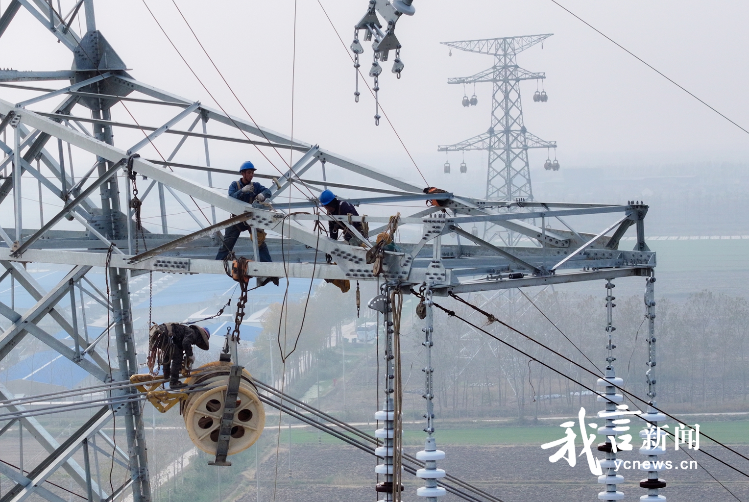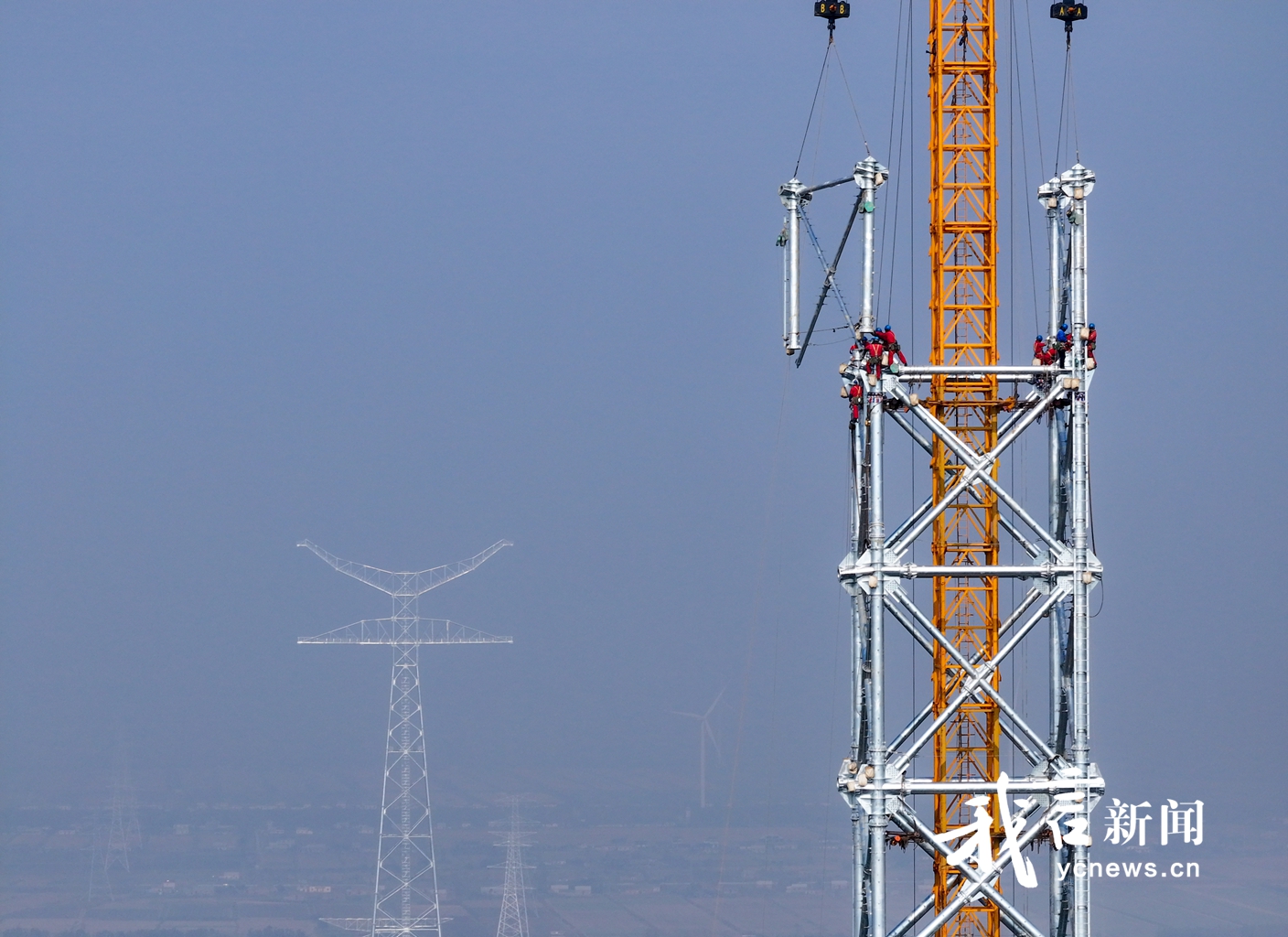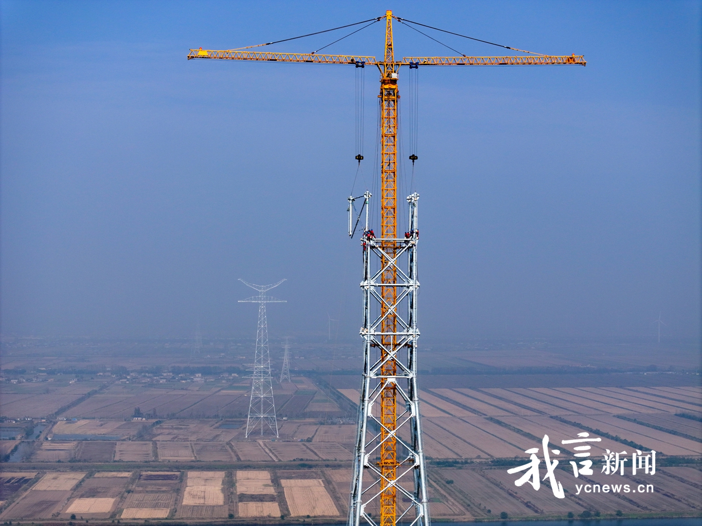 11月13日,苏北灌溉总渠南岸的射阳县临海镇六垛社区境内,工人正在跨越淮河入海水道的500千伏输电工程南侧跨越塔进行封顶作业。