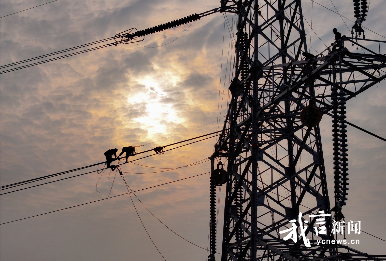 北侧铁塔已于9月底完工,连接跨越塔其他地段的放线工作同时紧张进行。