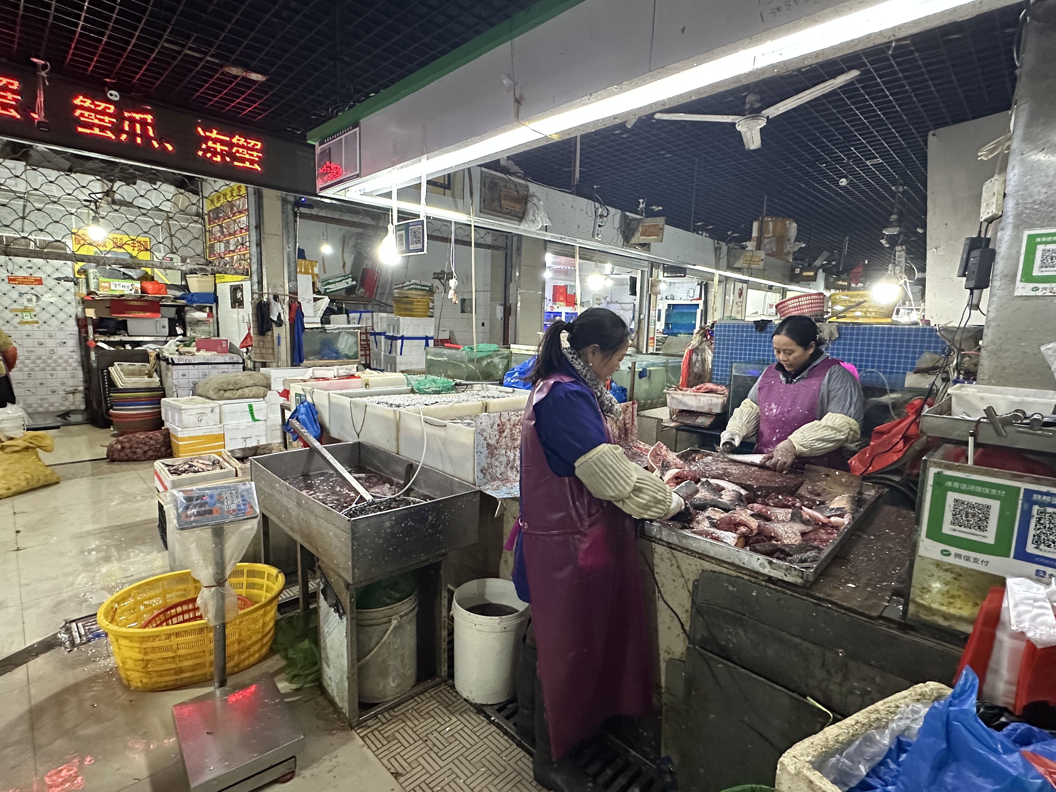 清晨的裕新菜市场,一楼水产区早已人声鼎沸。水池里,鱼儿不时跃出水面,溅起一片水花。摊主们手起刀落,熟练地为顾客处理活鱼。叫卖声、讨价还价声与鱼尾拍打水面的“啪啪”声交织在一起,混合着淡淡的鱼腥味,构成了一幅充满生命力的市井画卷。