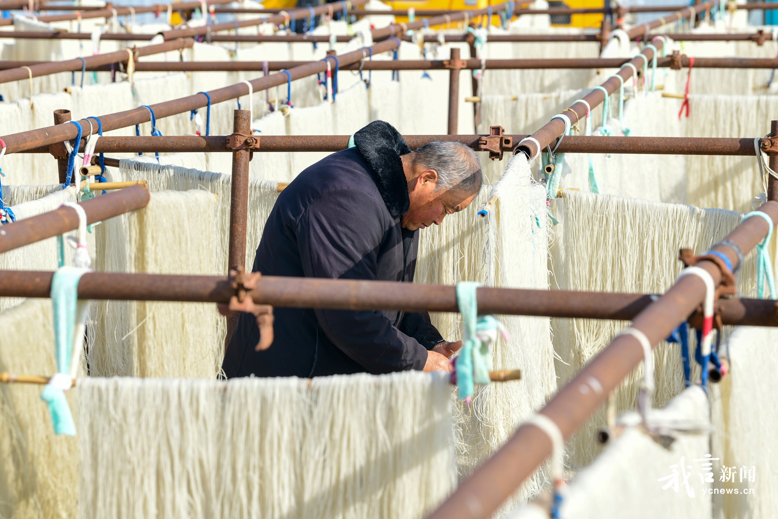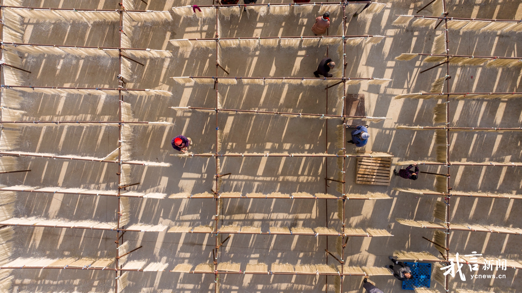 红薯粉丝由红薯精制而成,因其独特的口感和丰富的营养价值深受人们喜爱。近日,在滨海县宋二姐食品有限公司,村民正在晾晒红薯粉丝。