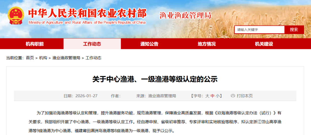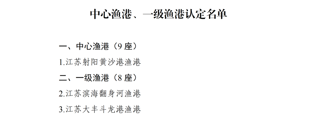 1月27日,农业农村部渔业渔政管理局公示中心渔港、一级渔港认定名单。其中,我市射阳黄沙港渔港拟认定为中心渔港,滨海翻身河渔港、大丰斗龙港渔港拟认定为一级渔港。