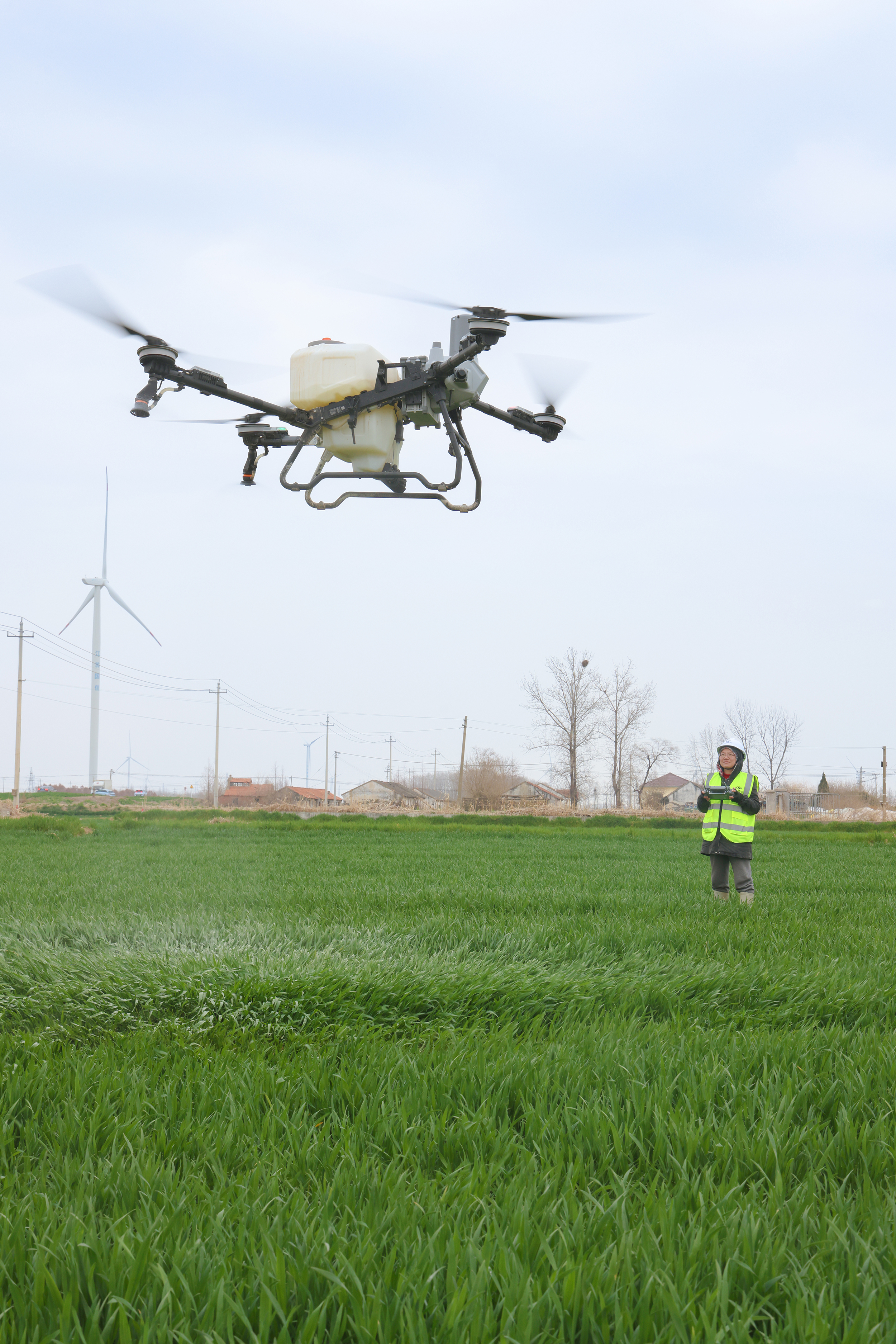 春耕时节,田野上迎来“空中力量”。3月11日,在射阳县的江苏农垦新洋农场,46岁的女无人机飞手吴荣芬正熟练操控着植保无人机,穿梭于绿意盎然的小麦田上空,为春季田间管理增添一抹科技亮色。