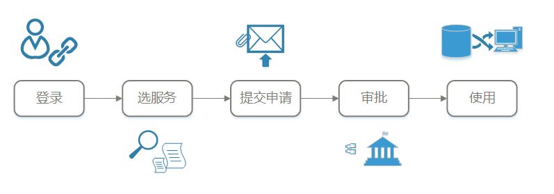 各用户根据自己业务系统的网络环境,登录对应的资源中心(互联网为http://218.206.157.203:8080/Portal/;政务网为http://2.142.141.31:8080/Portal),经过账号注册、预览和查看服务、服务申请等步骤,即可获取在线调用许可。