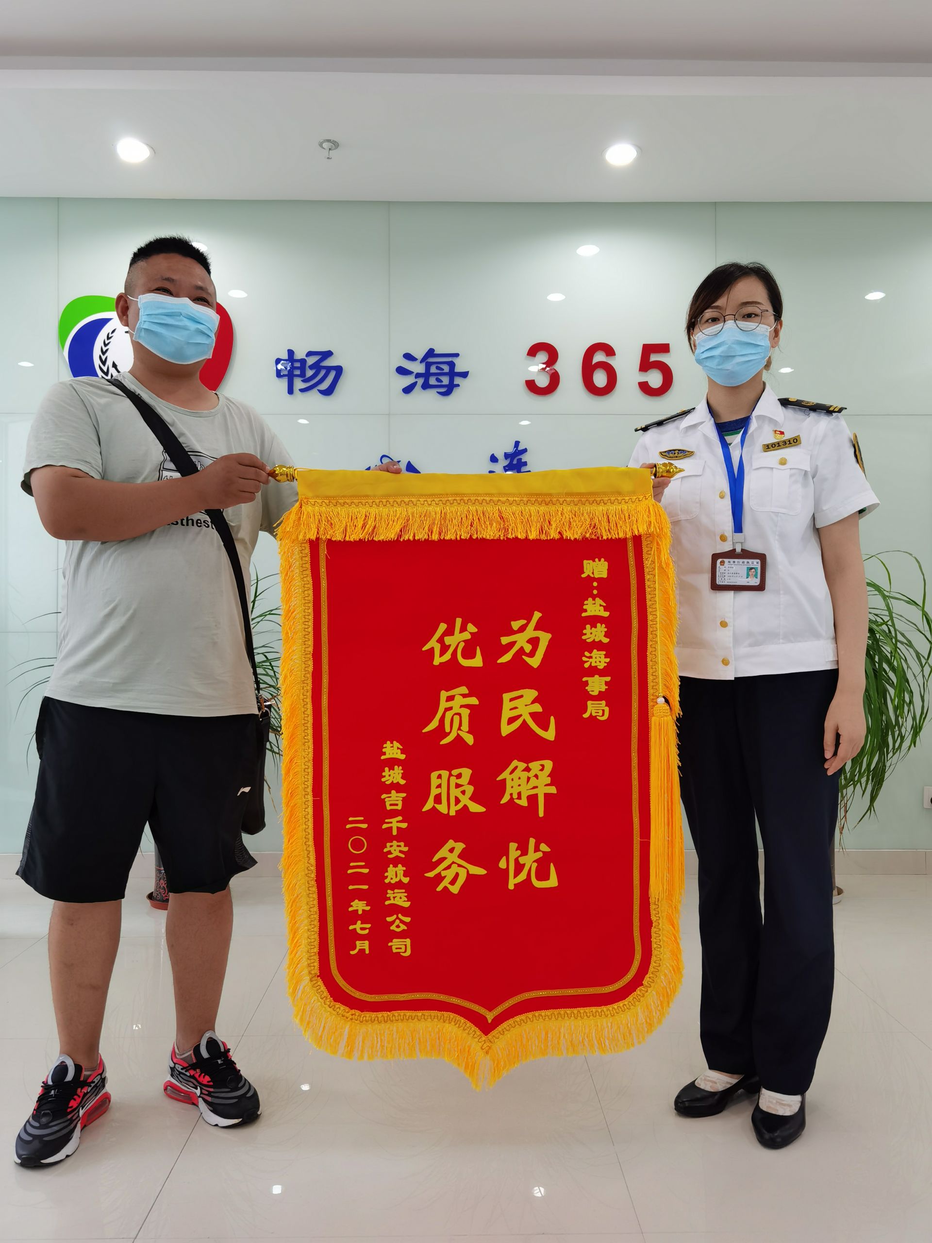 7月16日上午,盐城吉千安航运有限公司向盐城海事局政务中心赠送“为民解忧 优质服务”锦旗,对盐城海事局为公司首艘投入运营船舶办理船舶证书业务给予的帮助表示诚挚感谢。