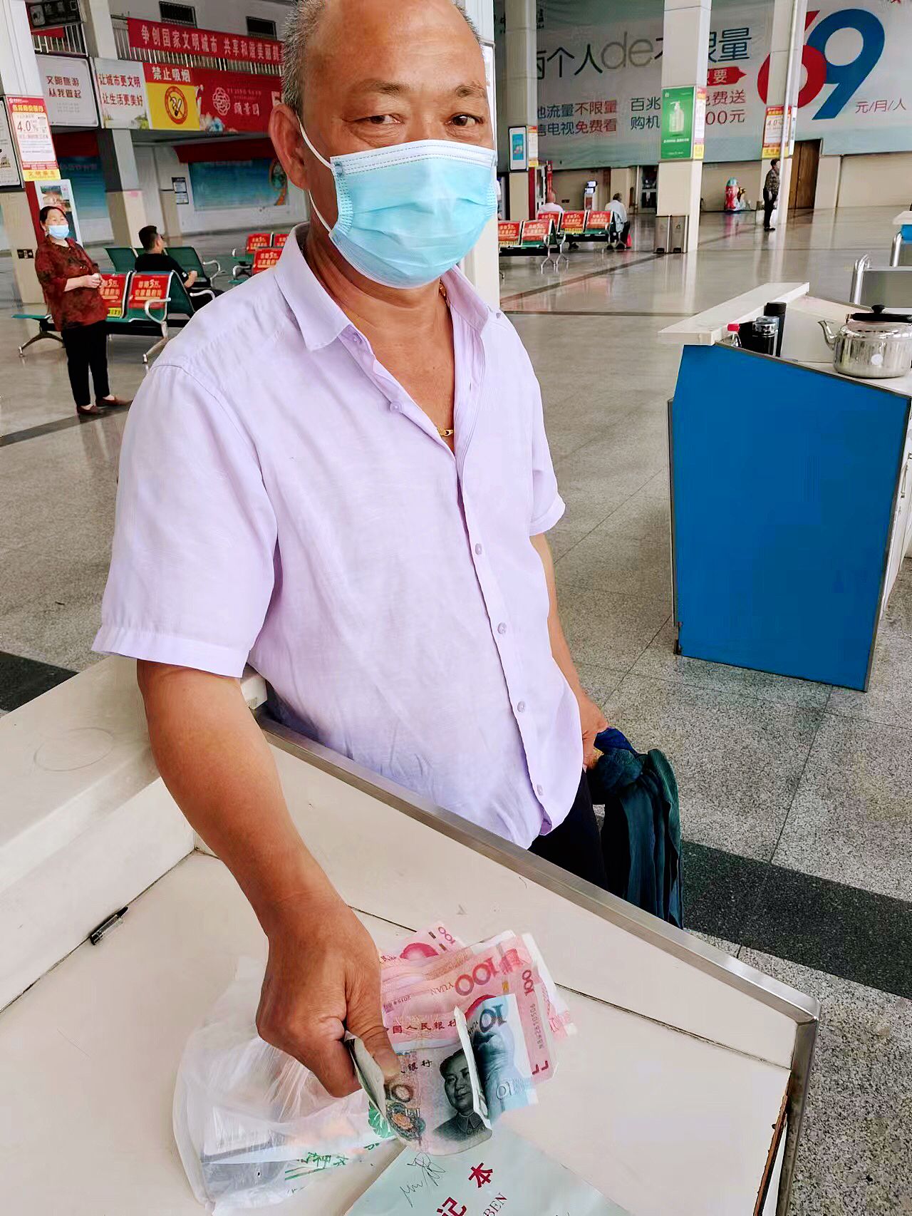7月28日上午8:29左右,射阳县海河线驾驶员王立春从海河发班到达汽车客运站,乘客全部下车后,王立春像往常一样清理车内卫生,当清理到倒数第二排座位时,发现坐凳上有一个小包和两盒药,王立春当急将小包和药送到值班窗口交到值班人员手中,值班人员和王立春当面打开小包,发现里面有720元现金和身份证、社保卡等证件。值班人员将所有物品进行了妥善保管,可等到7月30日都没有人来领取,就把所有物品转交到公司办公室,办公室人员根据身份证地址联系到复兴村村委会,终于将徐女士遗失的财物交还到本人手中。