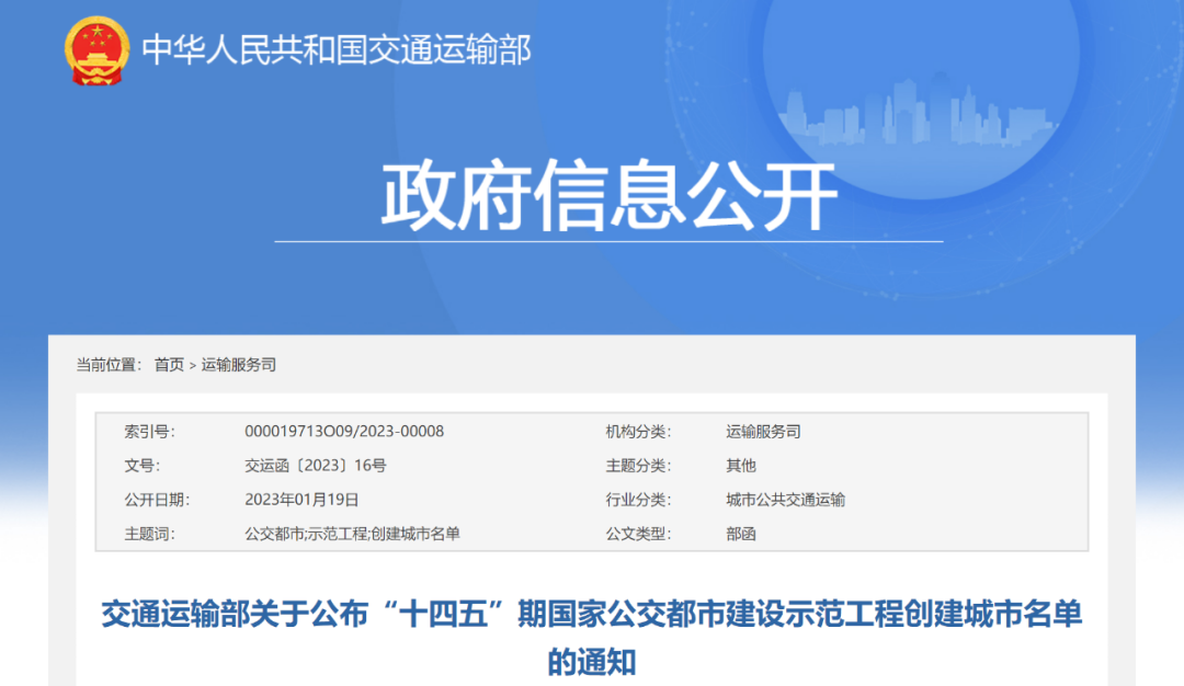 近日交通运输部公布“十四五”期国家公交都市建设示范工程创建城市名单。