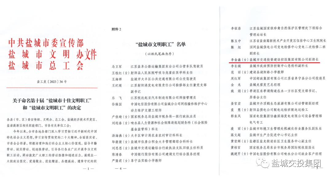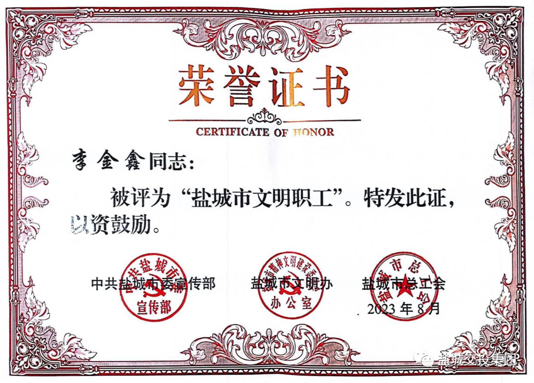 近日,经过基层推荐、专家评审、媒体公示等程序,市委宣传部、市文明办、市总工会联合发文命名并表彰了第十届 “盐城市十佳文明职工”和“盐城市文明职工”。盐城交投集团投融资部李金鑫同志被授予“盐城市文明职工”荣誉称号。