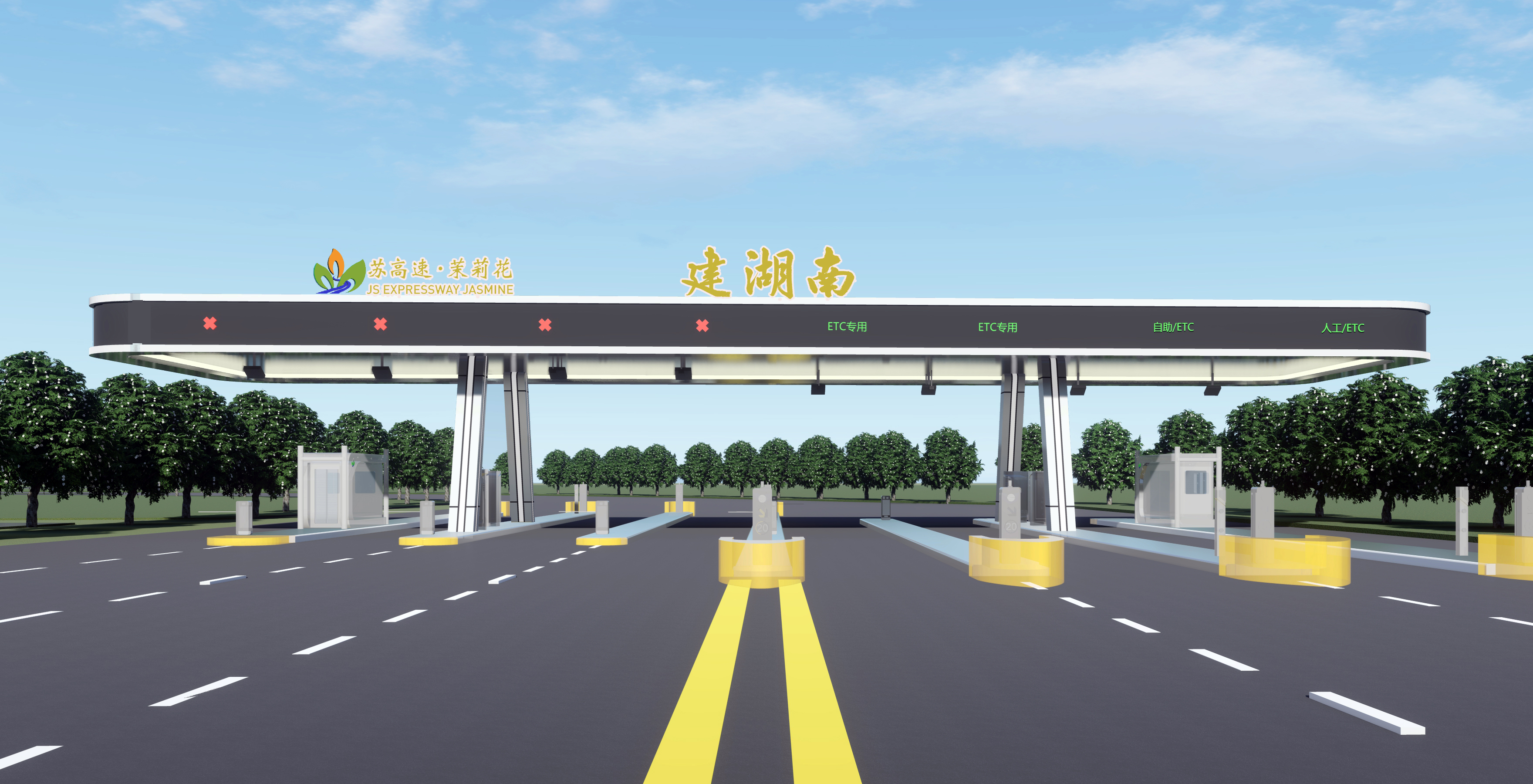 新型收费站收费大棚按照轻量化、信息化理念设计,不仅提高了通行效率,提升了收费站通行环境,而且节约了运营成本;收费广场采用窄岛化、集约化布局,为驾乘人员提供更为宽广的驾驶视野和更加舒畅的通行体验,具有通行快捷、收费精准、节约成本等特点,为准自由流“无感通行”的现代化新型收费站。