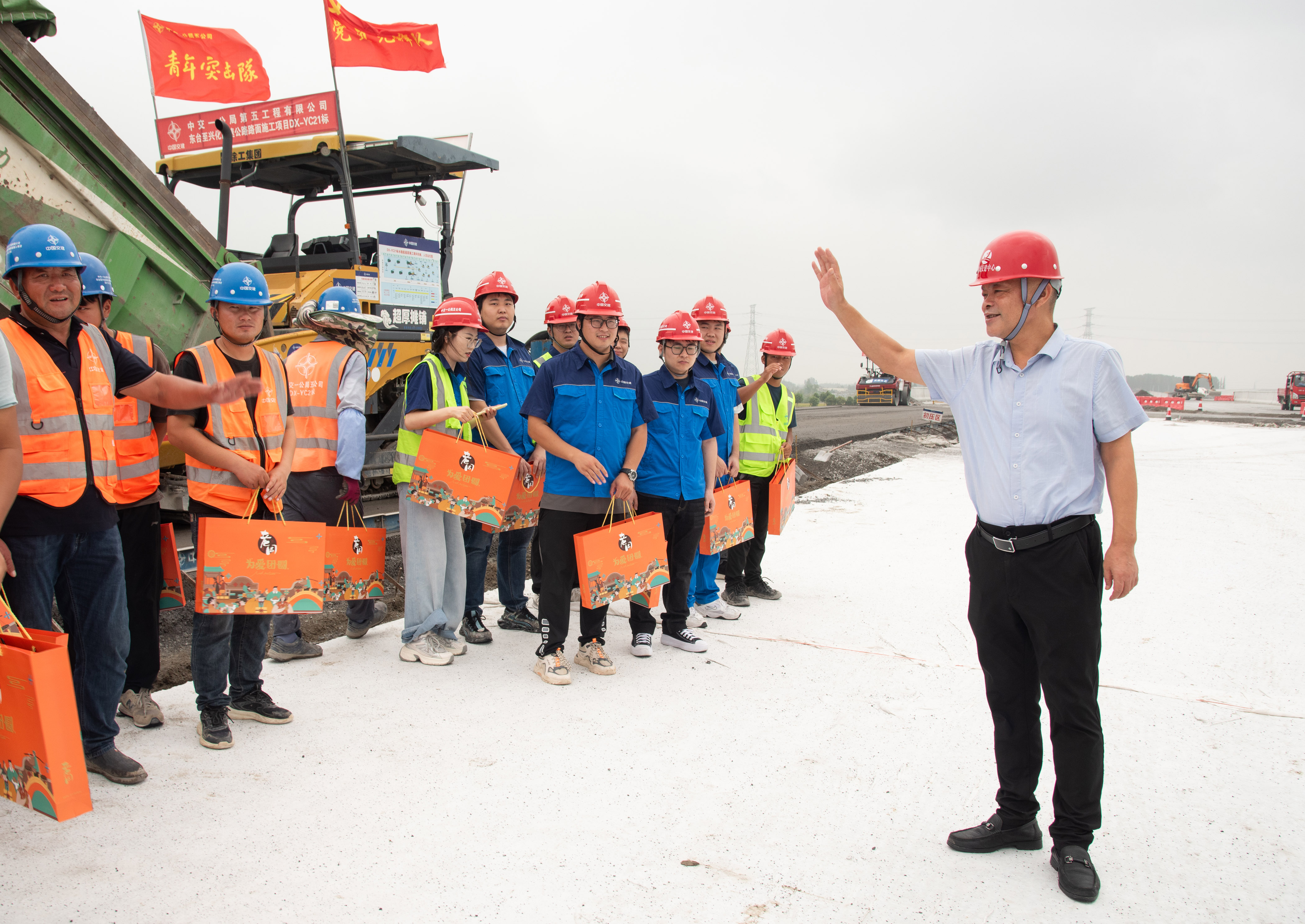 慰问组一行对大家为东兴高速建设付出的辛勤努力表示感谢,将满载着关怀与敬意的一盒盒月饼逐一送到工人们手中,并叮嘱各项目部在组织好节日生产的同时,务必做好后勤保障工作,让坚守工地的建设者们也能感受到家的温暖。在路面摊铺施工现场,许卫勉励全体建设者要继续发扬攻坚克难、精益求精的工匠精神,在确保工程质量和施工安全的前提下,科学调度、加快进度,全力将东兴高速打造成精品工程、民心工程,为完善区域路网、促进地方经济社会发展再立新功。