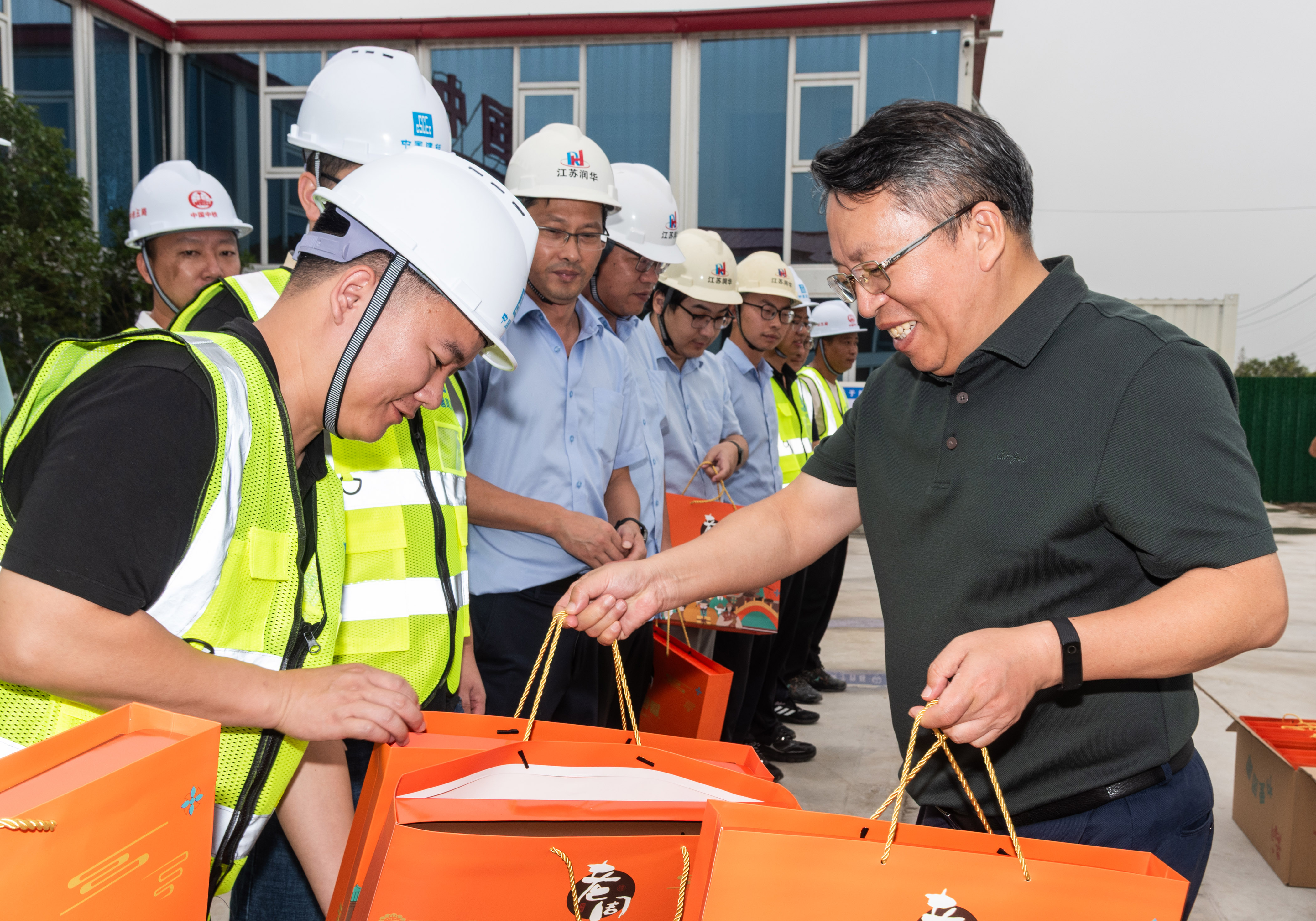 中秋佳节将至,9月28日,盐市交通运输局党委委员、三级调研员许卫带领交通工程建设中心相关处室负责人,奔赴东兴高速东台段各标段项目部和施工现场,看望慰问坚守岗位的广大工程建设者,为这些来自异乡的人们送上独具盐城地方特色的“老周月饼”,以及节日的诚挚祝福。
