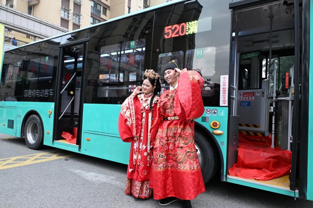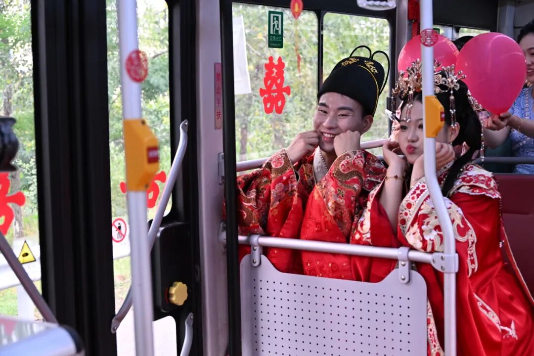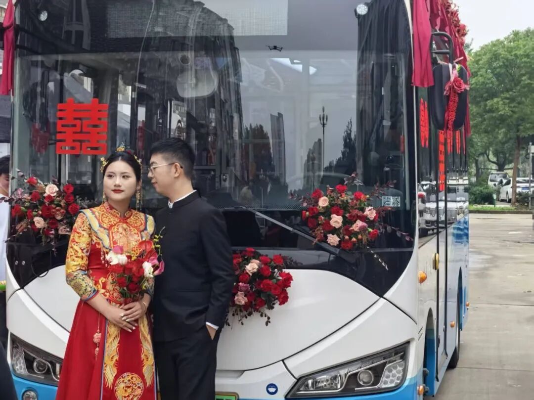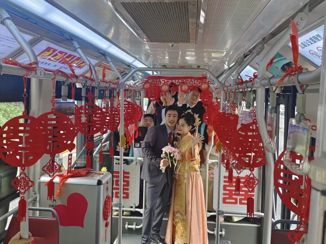 10月2日,公交公司26路驾驶员邵亚栋与新娘郭露露率先采用装饰一新的新能源公交车迎亲。车身缀满大红喜字和灯笼,车内滚动显示“金玉良缘”“幸福美满”的祝福语。一对新人身着传统汉服,在亲友的见证下完成了一场温馨而特别的婚礼。新娘表示,公交车不仅是丈夫的工作场所,更是两人爱情的见证,选择新能源车既响应国家低碳号召,也体现了年轻人对环保理念的践行。
