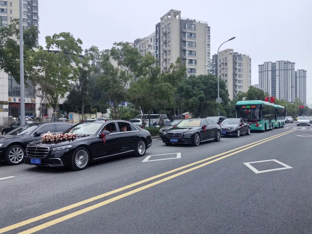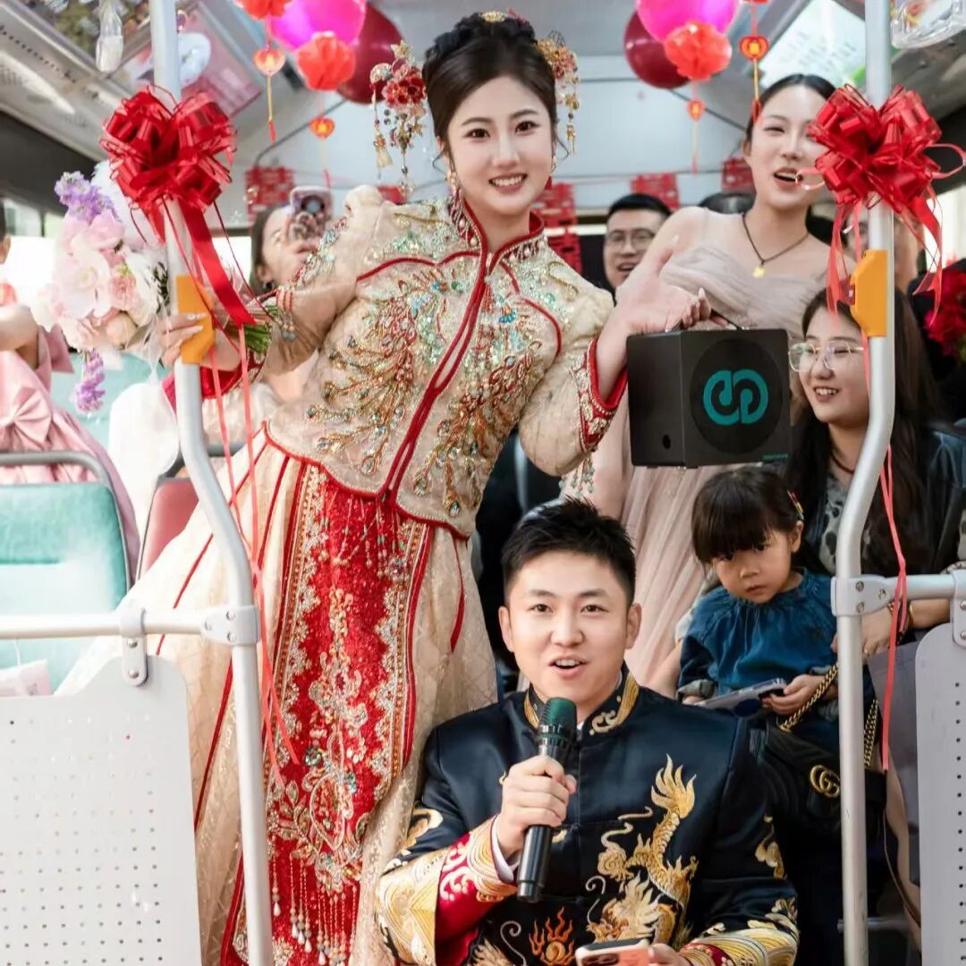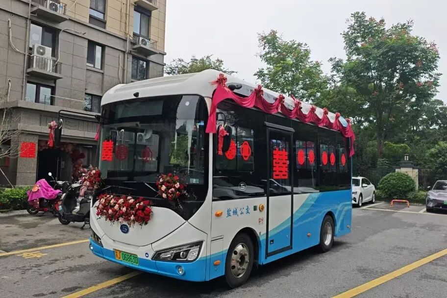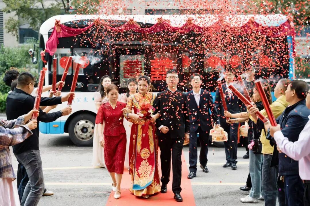 值得一提的是,国庆期间盐城还出现了“奔驰+公交”混搭的迎亲组合。新郎吴先生与新娘郭女士的迎亲车队由奔驰主婚车与两辆公交车组成,既保留了传统婚车的仪式感,又融入了公交服务的亲和与创意。公交车驾驶员提前到岗协助装饰车厢,用实际行动为新人送上祝福。